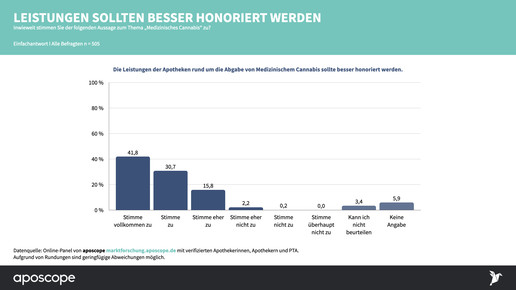 88 Prozent der Teilnehmer finden laut Umfrage, dass die Leistungen der Apotheken rund um die Abgabe von Medizinischem Cannabis besser honoriert werden sollten: Knapp 42 Prozent stimmen der Aussage vollkommen zu, weitere 31 Prozent stimmen zu und rund 16 Prozent stimmen eher zu.