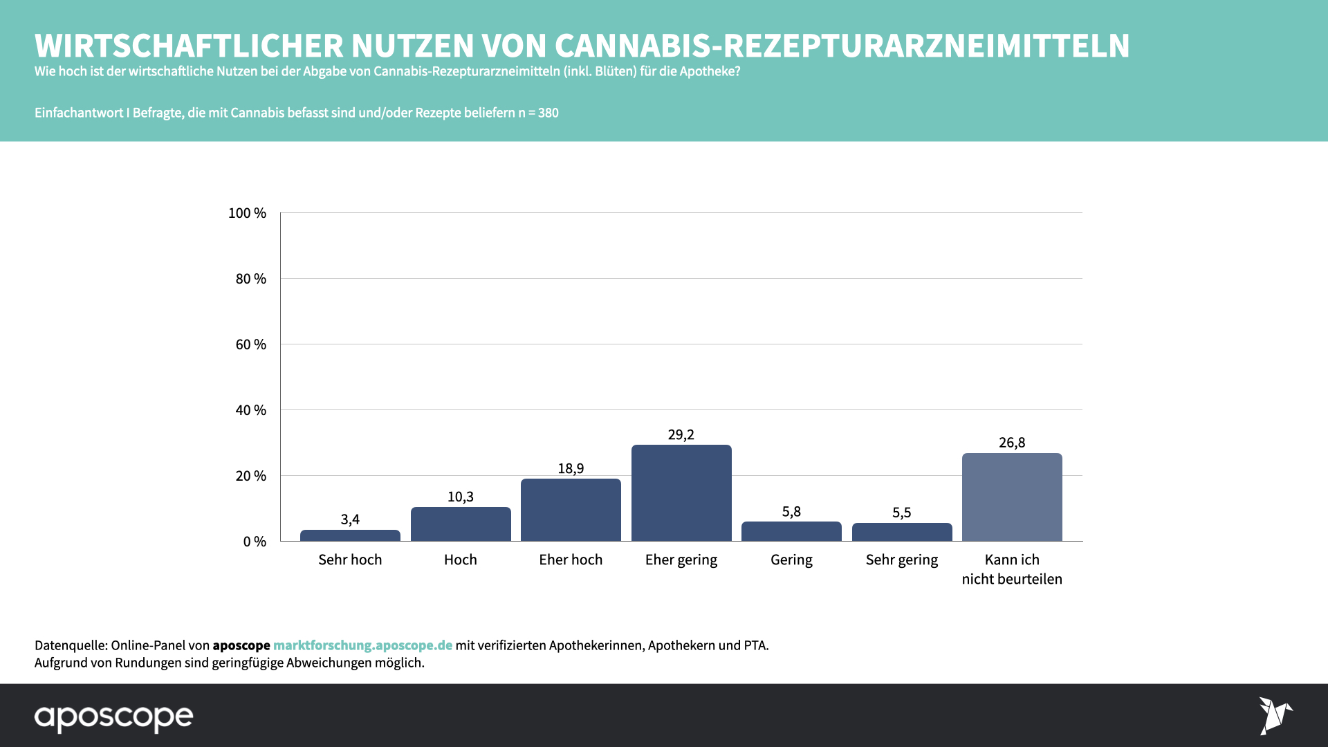 Denn auch wenn vermeintlich großzügige Aufschläge abgerechnet werden können: Am wirtschaftlichen Nutzen für die Apotheke zweifeln zahlreiche Teilnehmer des Panels: 29 Prozent sehen einen eher geringen, weitere 11 Prozent einen geringen oder sehr geringen Nutzen. Demgegenüber finden nur knapp ein Drittel der Befragten Rezepte über Cannabiszubereitungen lukrativ: 19 Prozent halten den wirtschaftlichen Nutzen für die Apotheke für eher hoch, weitere 10 Prozent für hoch und nur 3 Prozent für sehr hoch. 27 Prozent konnten dazu keine Einschätzung abgeben.