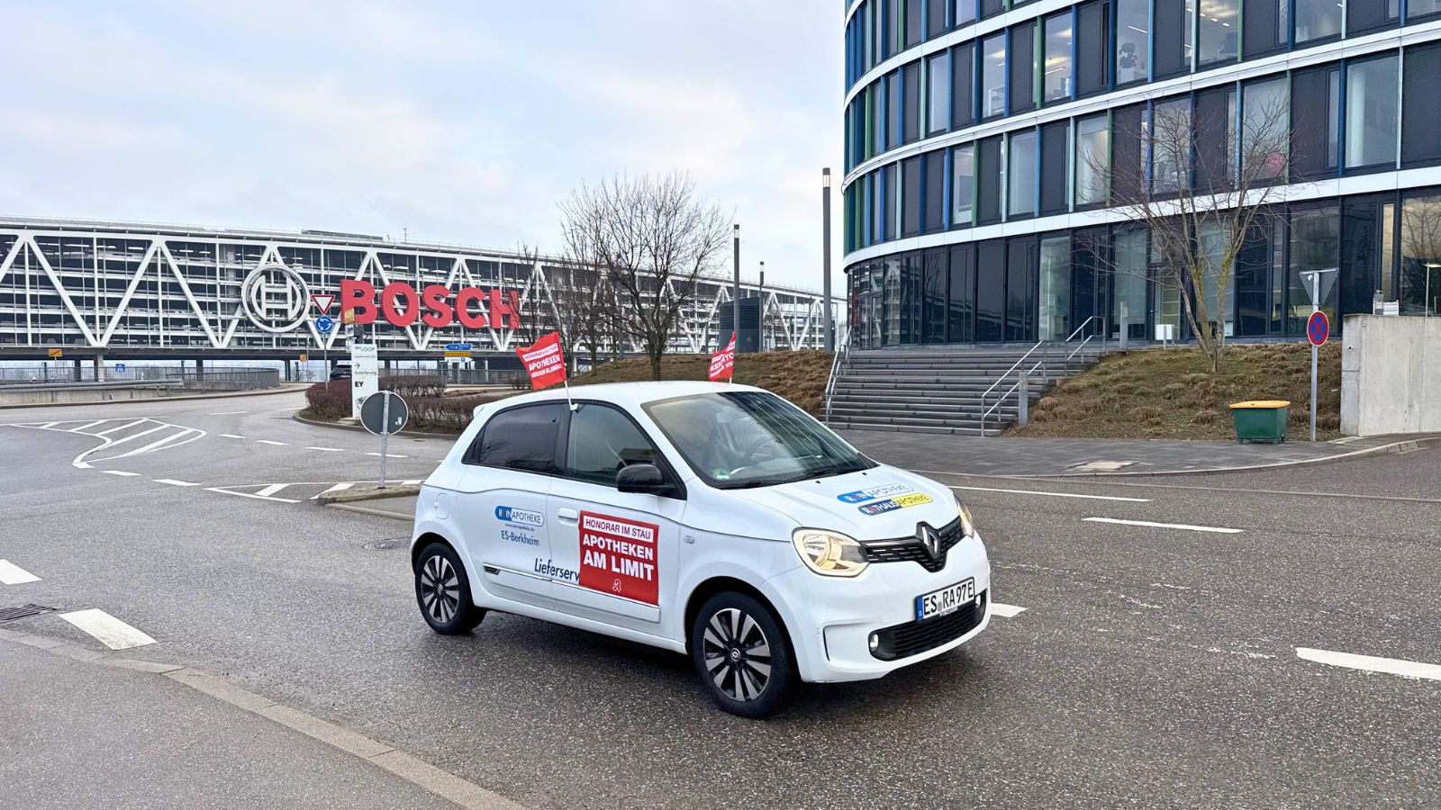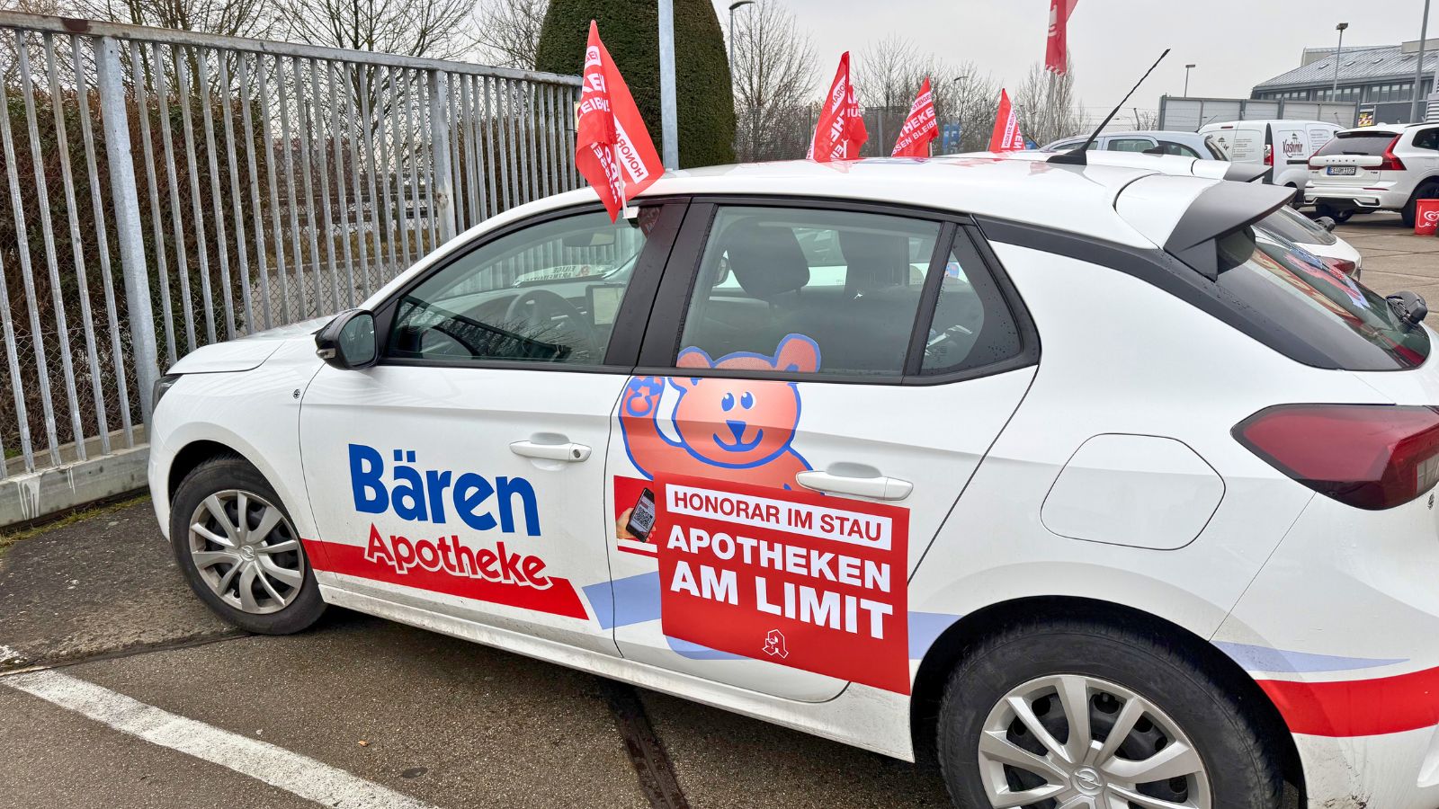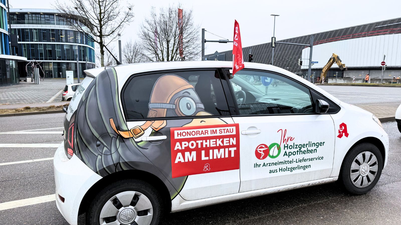 Die Apotheken starten ihren Flashmob rund um die Messe Stuttgart heute und morgen von 8 bis 10:30 Uhr. Erwartet werden 80 bis 150 Botenautos, die mehrere Runden um das Messegelände drehen oder sich gut sichtbar im Parkhaus P22 positionieren. Die Autos sind mit Magnetfolie und Fahnen versehen. „Honorar im Stau! Apotheken am Limit“, ist auf den Fahrzeugen zu lesen. „Honorar muss steigen – Apotheken müssen bleiben“, heißt es auf den Fahnen.