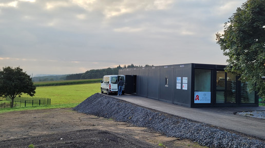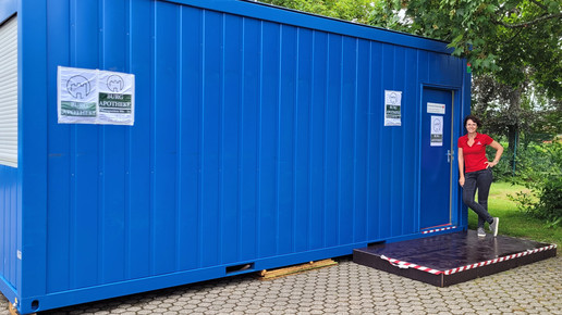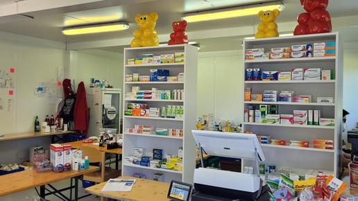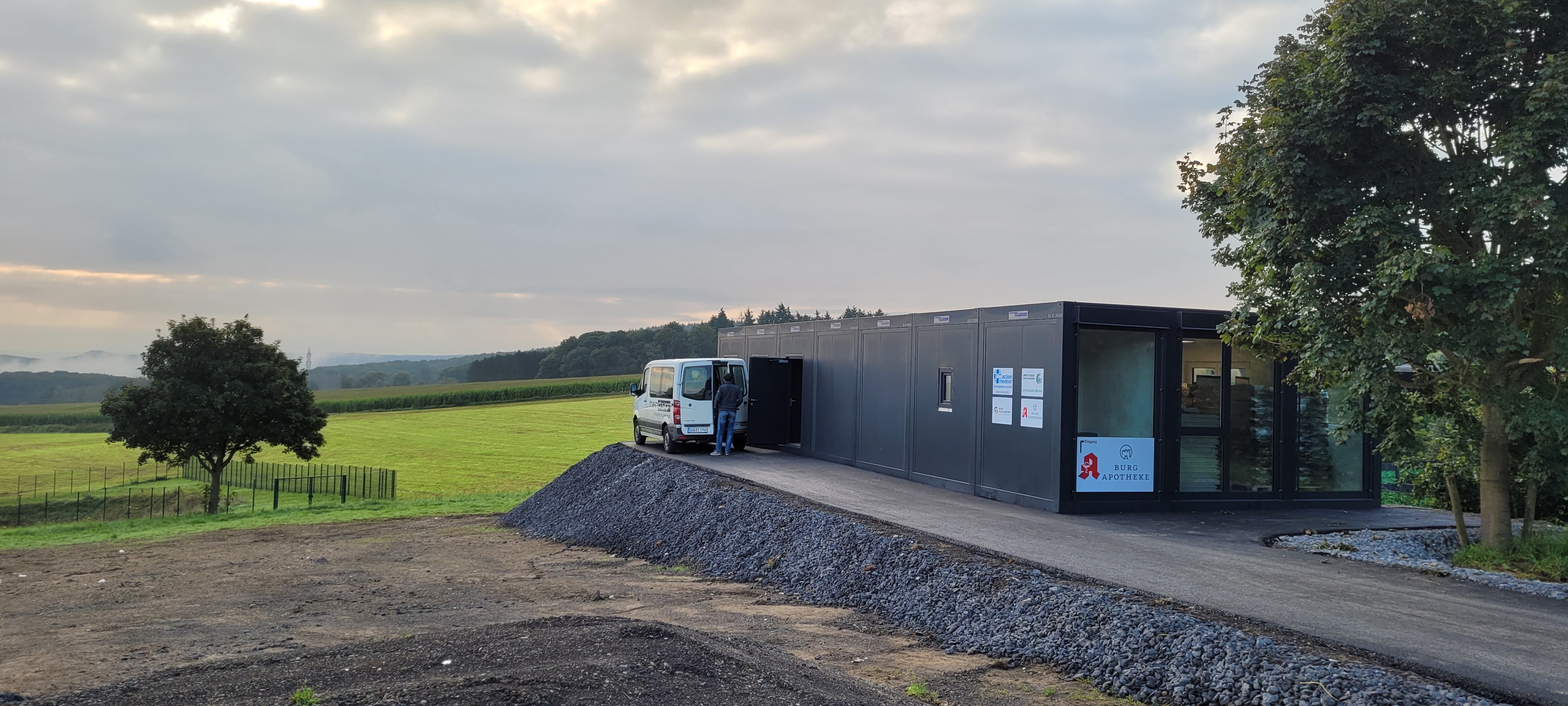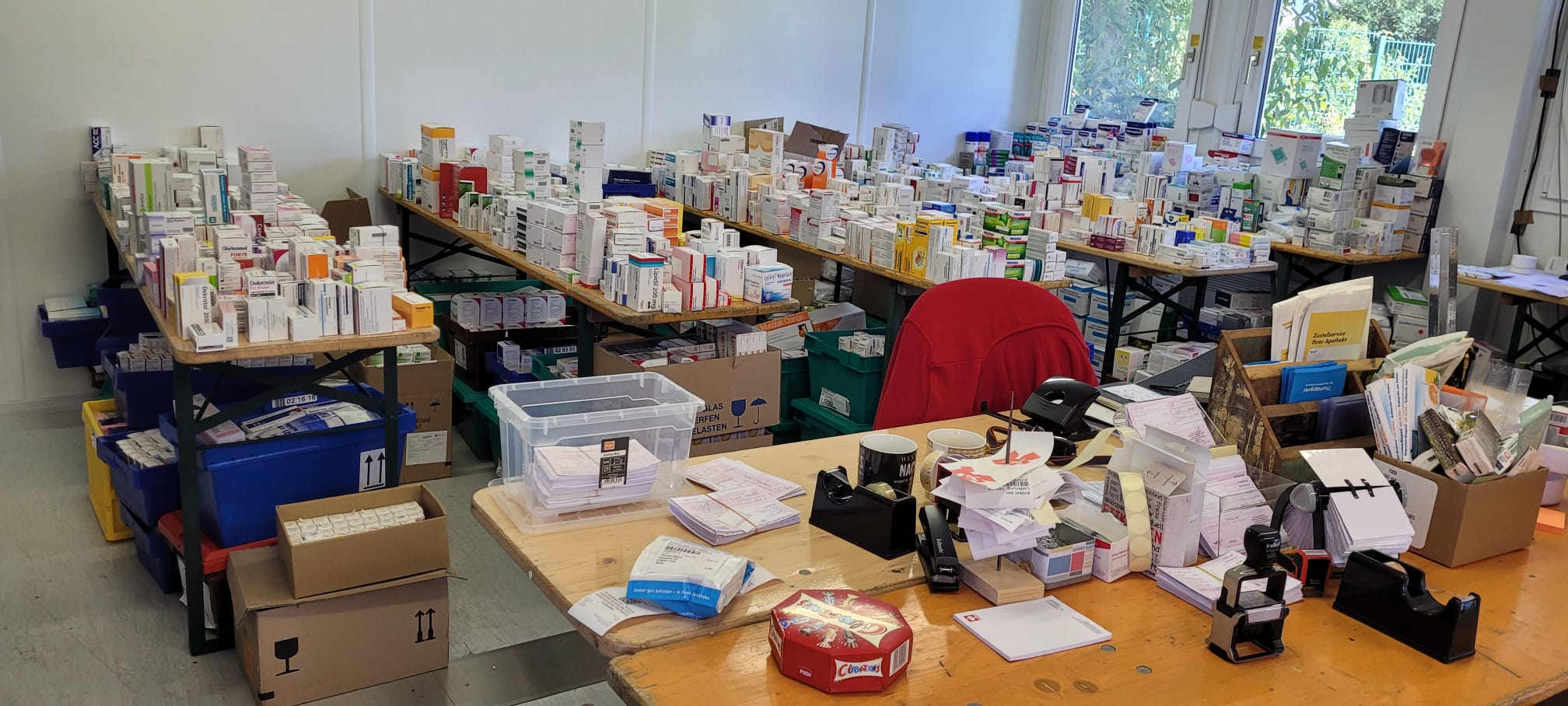 Seit vergangener Woche findet die Apotheke gemeinsam mit einer Hausarztpraxis ihren Platz in einem Container in Kalenborn – auf etwa 100 Quadratmetern. Die neuen „Räumlichkeiten“ wurden von Action Medeor, Apotheker ohne Grenzen (AoG) und dem Deutschen Medikamenten-Hilfswerk gespendet. Das Gelände wurde von einem Hotelier zur Verfügung gestellt. Mindestens ein Jahr sollen Hausarztpraxis und Apotheke nun im Container bleiben.