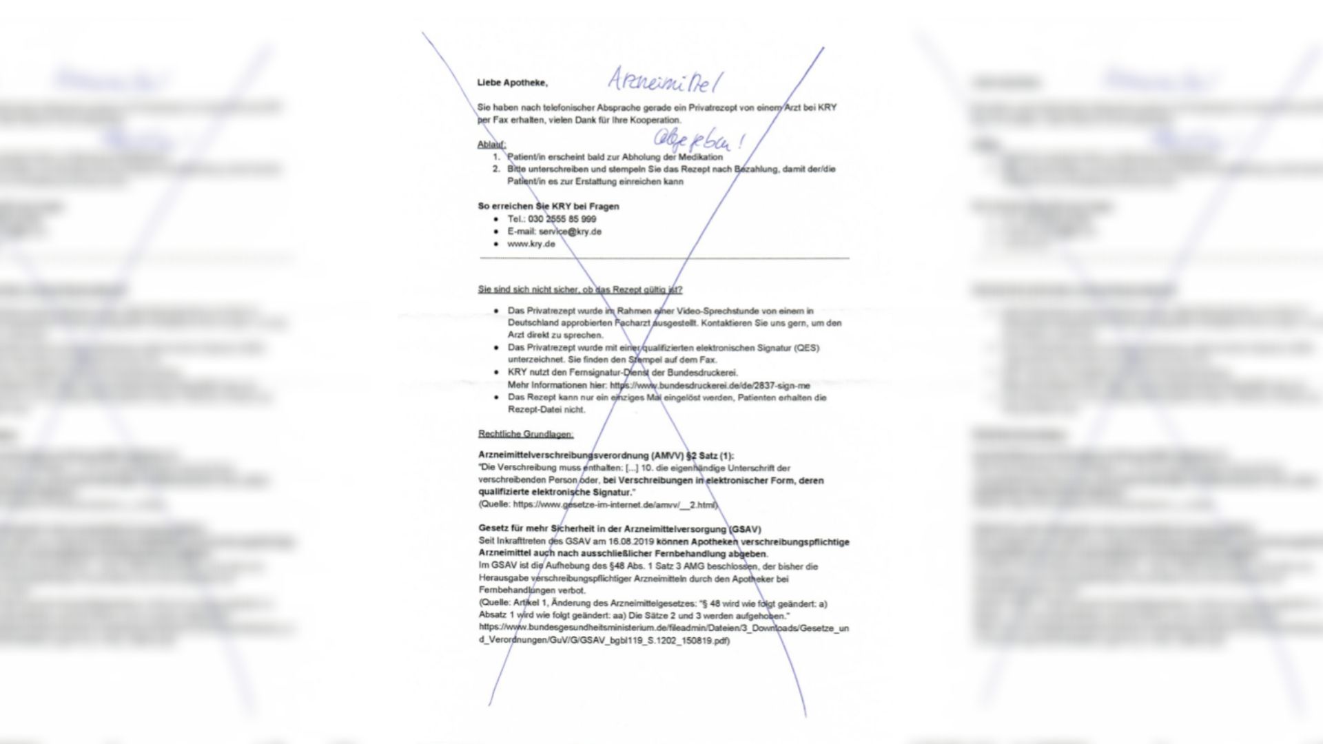 Der Infoflyer erklärt den Apothekenmitarbeitern, was ihnen gerade widerfährt: „Liebe Apotheke, Sie haben nach telefonischer Absprache gerade ein Privatrezept von einem Arzt bei Kry per Fax erhalten, vielen Dank für Ihre Kooperation.“ Der Patient erscheine bald zur Abholung der Medikation. „Bitte unterschreiben und stempeln Sie das Rezept nach Bezahlung, damit der/ die Patient/in es zur Erstattung einreichen kann.“ Dass die Apotheken dem Braten nicht ganz trauen, hat man bei Kry antizipiert: „Sie sind sich nicht sicher, ob das Rezept gültig ist?“ Mit ein paar Infos soll den Apothekern die Angst genommen werden: Das Rezept wurde im Rahmen einer Videosprechstunde von einem approbierten Facharzt ausgestellt. „Kontaktieren Sie uns gern, um den Arzt direkt zu sprechen.“