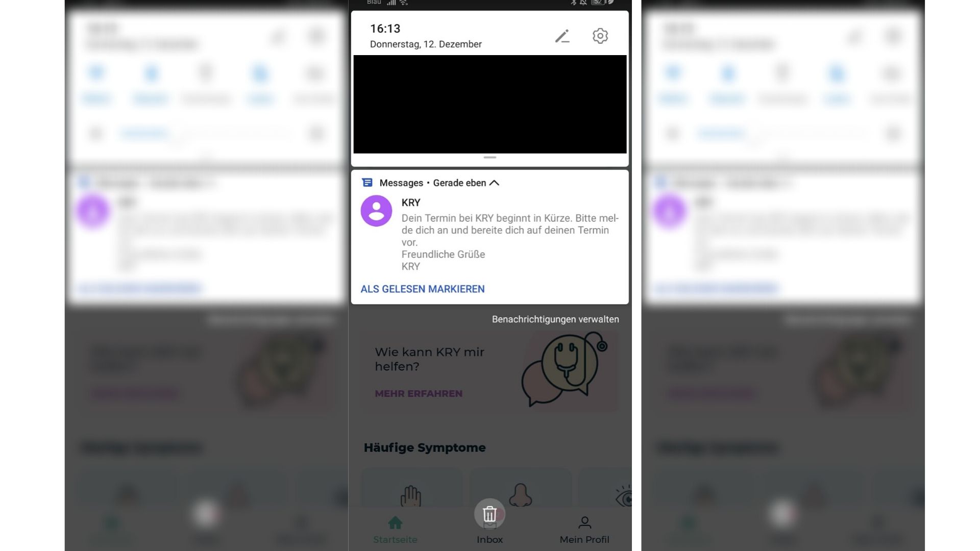 Daraufhin wird der nächstmögliche Termin angezeigt. Es ist 16.12 Uhr und wir können einen Termin um 16.20 Uhr buchen – was wir auch tun. Die Kry-App fragt uns: „Wobei können wir dir helfen?“ Von A wie Akne bis V wie Verstopfung werden zahlreiche Beschwerdebilder angezeigt. Wir haben einen Harnwegsinfekt und klicken auch darauf. Es erscheint ein Warnhinweis, der auf das konkrete Beschwerdebild zugeschnitten scheint: „Wichtig zu wissen: Lass dich in einer Arztpraxis oder beim Notarzt behandeln, wenn du Fieber oder wiederkehrende starke Schmerzen hast, oder wenn du vor kurzem am Bauch operiert wurdest.“
