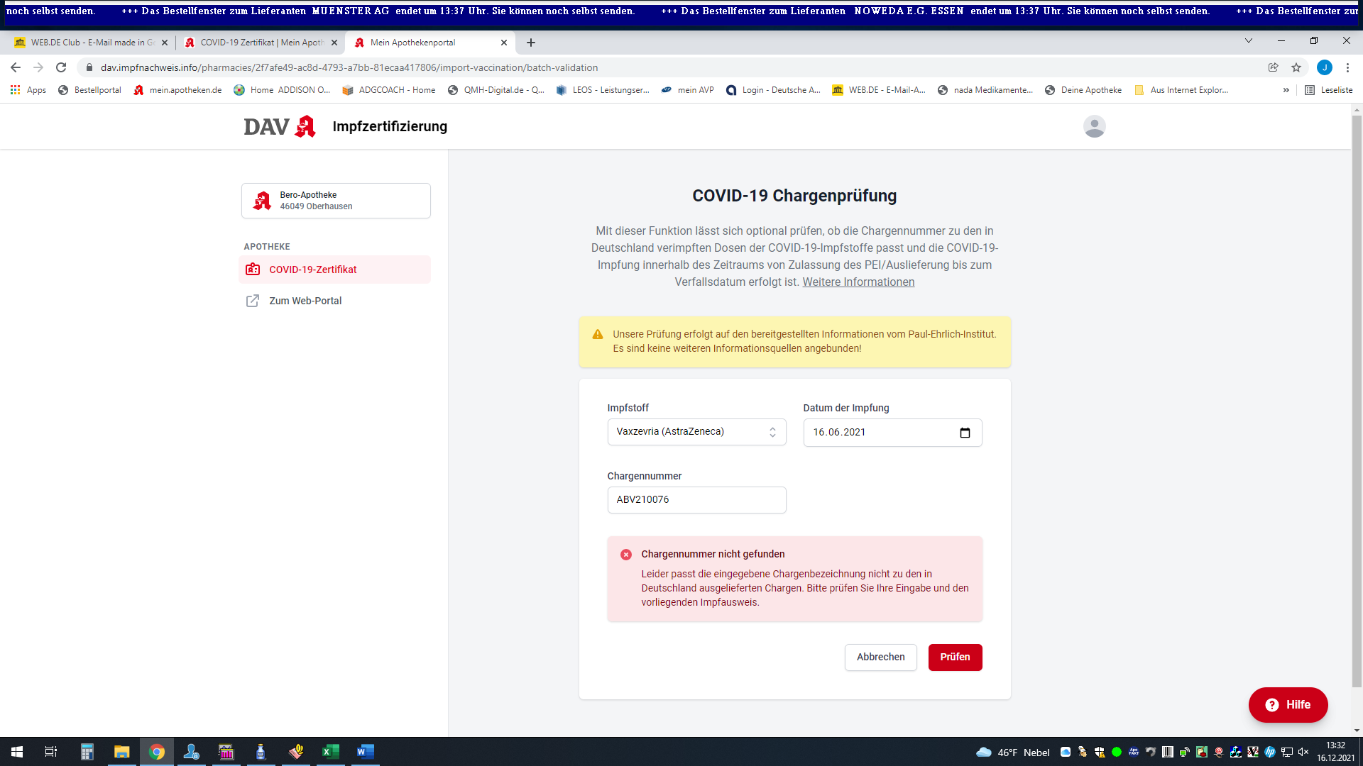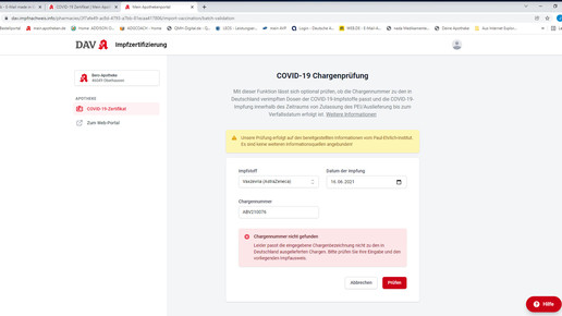 Das Portal meldete: „Chargennummer nicht gefunden. Leider passt die eingegebene Chargenbezeichnung nicht zu den in Deutschland ausgelieferten Chargen. Bitte prüfen Sie Ihre Eingabe und den vorliegenden Impfausweis.“ Die Apothekerin ist sich sicher, dass es in ihrer Dokumentation keinen Fehler gibt, und warnt Kolleg:innen, sich von der Aussage bei der tatsächlichen Überprüfung fehlleiten zu lassen: „Ich hoffe, dass bisher noch keine Apotheke Kunden auf Grund dessen abgewiesen hat“, sagt sie.