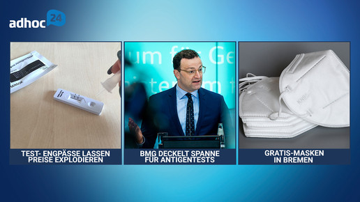 Aufgrund der steigenden Preise will Bundesgesundheitsminister Jens Spahn (CDU) die Spanne für Antigentests deckeln. Gleichzeitig sind diese immer schwieriger für Apotheken zu bekommen. Und in Bremen werden ab Freitag kostenlose Masken verteilt. Diese und weitere wichtige Meldungen des Tages bei adhoc24.