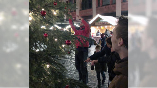Vielen Bürgern gefiel es jedoch gar nicht, dass ihr Baum jetzt wieder beinahe kahl war. Auf Facebook organisierten sich die Mitglieder der Gruppe „Ahlener helfen Ahlenern“. Die hängten die Kugeln – so weit sie mit Leitern kamen – am Wochenende wieder auf. „Am Samstag spielte Schalke gegen Dortmund, ich konnte nicht mal das Spiel richtig schauen, weil ständig mein Telefon klingelte“, sagt Bußmann. Böse sein konnte er den Anrufern nicht, schließlich ging es um die Weihnachtskugeln – und die sollten wieder an ihren Platz. „Ich bin nach dem Fußballspiel hingefahren, da haben rund 25 Menschen den Baum neu geschmückt. Eine Kaffee-Besitzerin schmiss eine Runde und spendete Kaffee und Glühwein.“