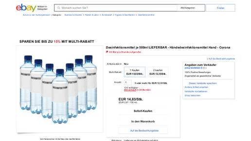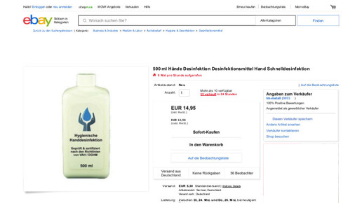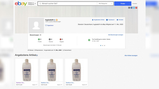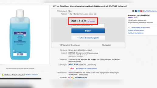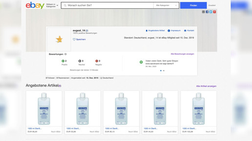 Rechtsanwalt Diekmann hat sich daher verschiedene Anbieter im Auftrag von Kraus genauer angesehen. Und wurde meist schnell fündig. So hat etwa die Firma Mühlich Metallerzeugnisse unter dem Verkäufernamen tm-metall bei Ebay ihr Portfolio erweitert. Zählen sonst Druck- und Zugfedern, Maschinenbauteile und Spezialwerkzeuge zum Sortiment, wurde auf dem Online-Marktplatz unlängst Desinfektionsmittel in einer Halbliterflasche angeboten.