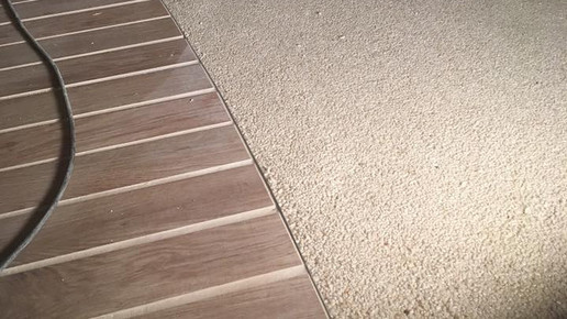 Eine riesige beleuchtete Wand mit einem 7,5 mal zwei Meter großen Strandmotiv ist das Herz der Offizin. Davor Glasregale im maritimen Stil, statt Seitenwänden halten Stricke die Einlegeböden. Es gibt Bullaugen, einen imposanten Fototapeten-Steg, der zur Toilette führt und einen Offizin-Boden, an dessen Details liebevoll getüftelt wurde. Nun symbolisieren schmale Holzplatten Holzstege, sie wurden neben dem „Sandboden“ (heller Teppich) verlegt. Darunter wurde eine Fußbodenheizung installiert.