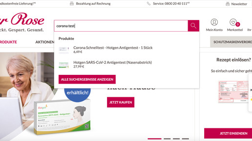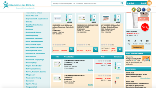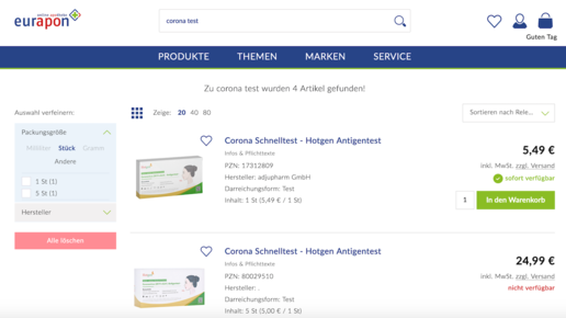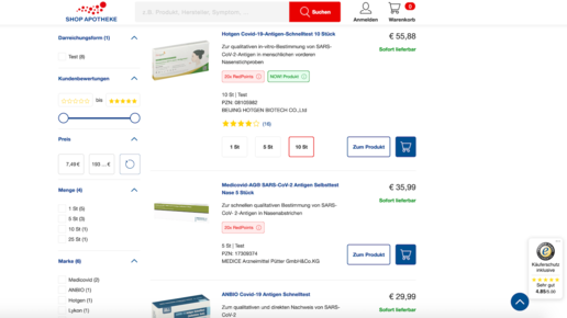 Anders bei DocMorris: Hier findet man auf Anhieb überhaupt keinen Hinweis auf die neue Produktkategorie. Noch in der vergangenen Woche ergab auch die Suche keinerlei Treffer. Zu den Gründen äußert sich ein Sprecher auf Nachfrage nicht, nur so viel: „Inzwischen ist wieder ein Laientest bei uns im Shop verfügbar.“