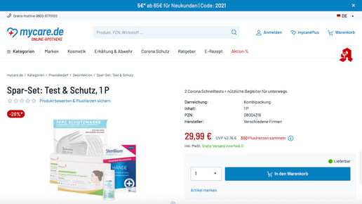 Mycare hat die Tests bereits in ein Bundle aufgenommen: Das „Spar-Set Test & Schutz“ enthält zweimal den Hotgen-Nasentest, zehn FFP2-Masken, eine 10er-Packung Sterillium-Desinfektionstücher sowie 50 ml Händedesinfektionsgel von Milinda zum Preis von 29,99 Euro. Der Einzelpreis der Produkte liegt bei mehr als 40 Euro.