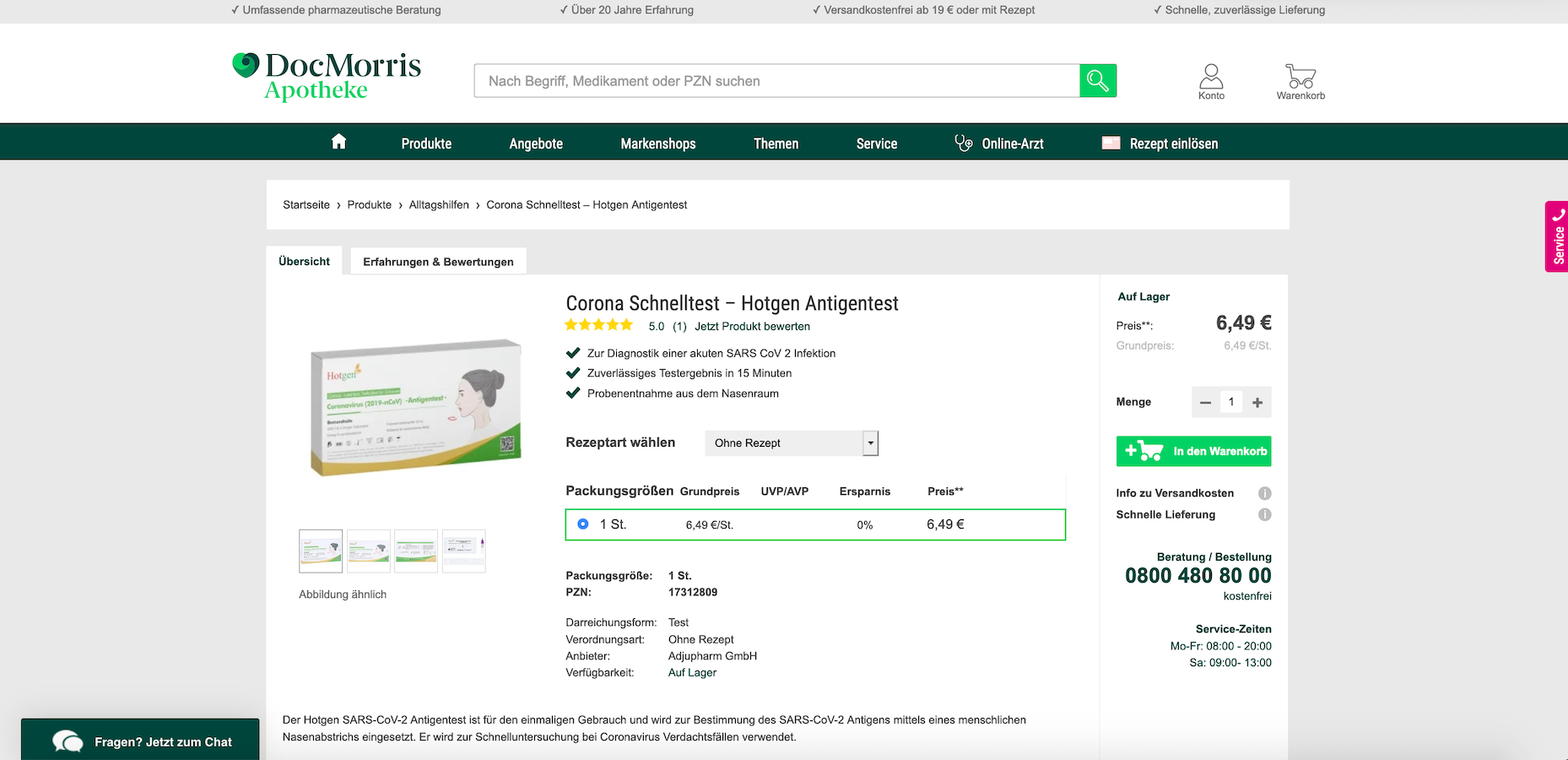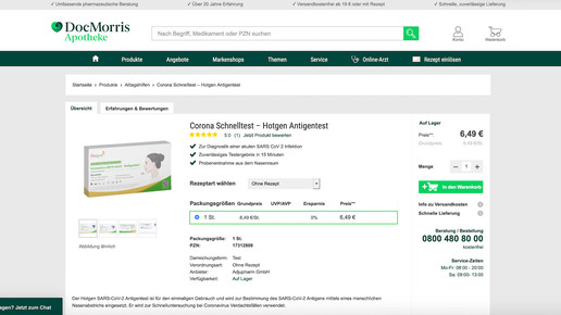 Und tatsächlich: Der Hotgen Antigentest ist jetzt in Gestalt des Nasenabstrichs im Webshop zu finden, Lieferant ist die Firma Adjupharm aus Bad Oldesloe. Angeboten wird ausschließlich die Einzelpackung zum Preis von 6,49 Euro. Genauso viel kostet das Produkt bei Apo-Discounter, Shop Apotheke ist mit 6,39 Euro marginal billiger und bietet außerdem Packungen à 5 und 10 Stück an.