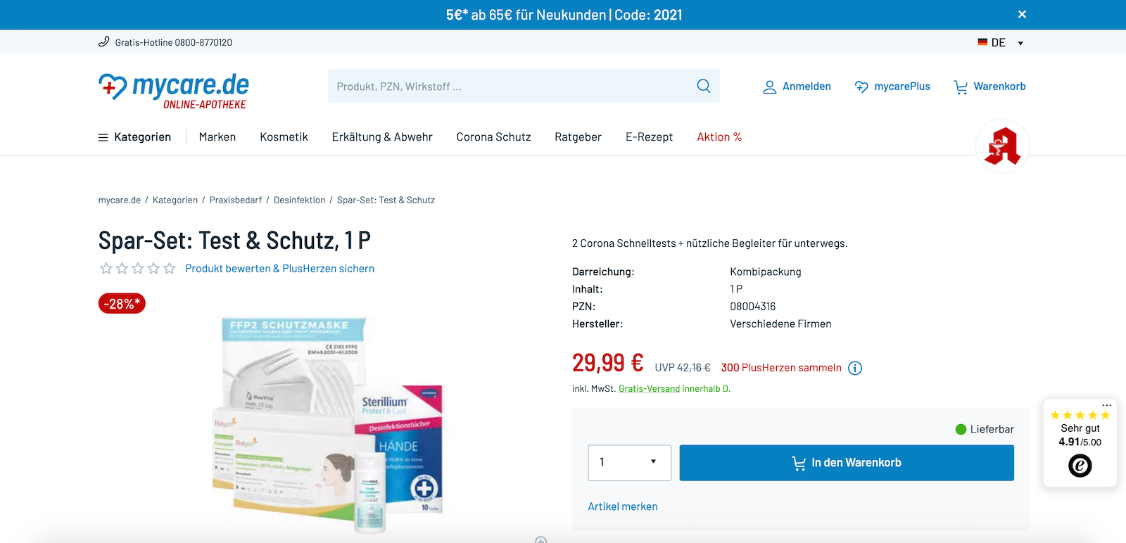 Mycare hat die Tests bereits in ein Bundle aufgenommen: Das „Spar-Set Test & Schutz“ enthält zweimal den Hotgen-Nasentest, zehn FFP2-Masken, eine 10er-Packung Sterillium-Desinfektionstücher sowie 50 ml Händedesinfektionsgel von Milinda zum Preis von 29,99 Euro. Der Einzelpreis der Produkte liegt bei mehr als 40 Euro.