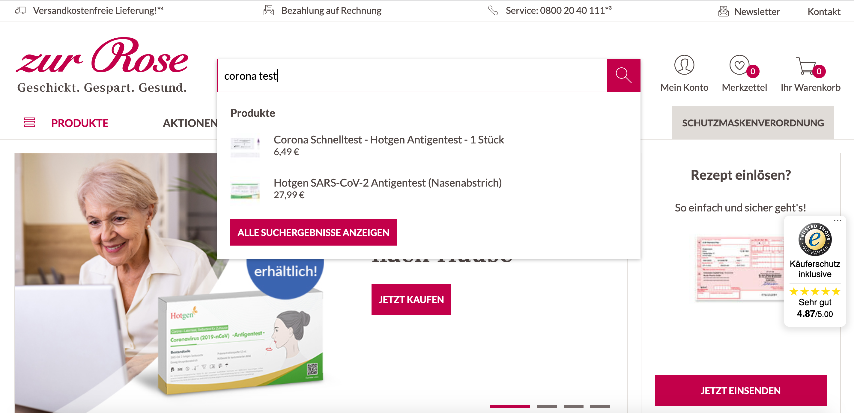 Anders bei DocMorris: Hier findet man auf Anhieb überhaupt keinen Hinweis auf die neue Produktkategorie. Noch in der vergangenen Woche ergab auch die Suche keinerlei Treffer. Zu den Gründen äußert sich ein Sprecher auf Nachfrage nicht, nur so viel: „Inzwischen ist wieder ein Laientest bei uns im Shop verfügbar.“
