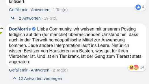 Was als Beruhigung gedacht war, verärgerte allerdings weitere Kommentatoren. „Wenn die Tierbesitzer am besten wüssten, was am Besten für ihre Tiere ist, wären Veterinärmediziner überflüssig“, schreibt eine Nutzerin. Ein anderer Kommentator ist verärgert: „Das einzige, was hier ins Leere läuft, ist dieser jämmerliche Versuch einer Rechtfertigung.“ Generell kritisierte die Community, dass es sich nicht um eine neutrale Information zu Homöopathie handele, da es eindeutig als Tipp von Apothekern präsentiert werde.