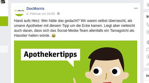 „Unser Tipp für gesunde Vierbeiner“, steht auf dem Bild, das einen Apotheker mit erhobenen Zeigefinger zeigt. Weiter heißt es: „Bach-Blüten und homöopathische Mittel werden auch in der Behandlung von Haustieren immer beliebter.“ Dem Posting-Text zufolge war man bei DocMorris selbst überrascht, „als unsere Apotheker mit diesem Tipp um die Ecke kamen“. Von der Versandapotheke war dieser Beitrag wohl witzig gemeint, bei den Facebook-Nutzern kam der Post hingegen nicht so gut an.
