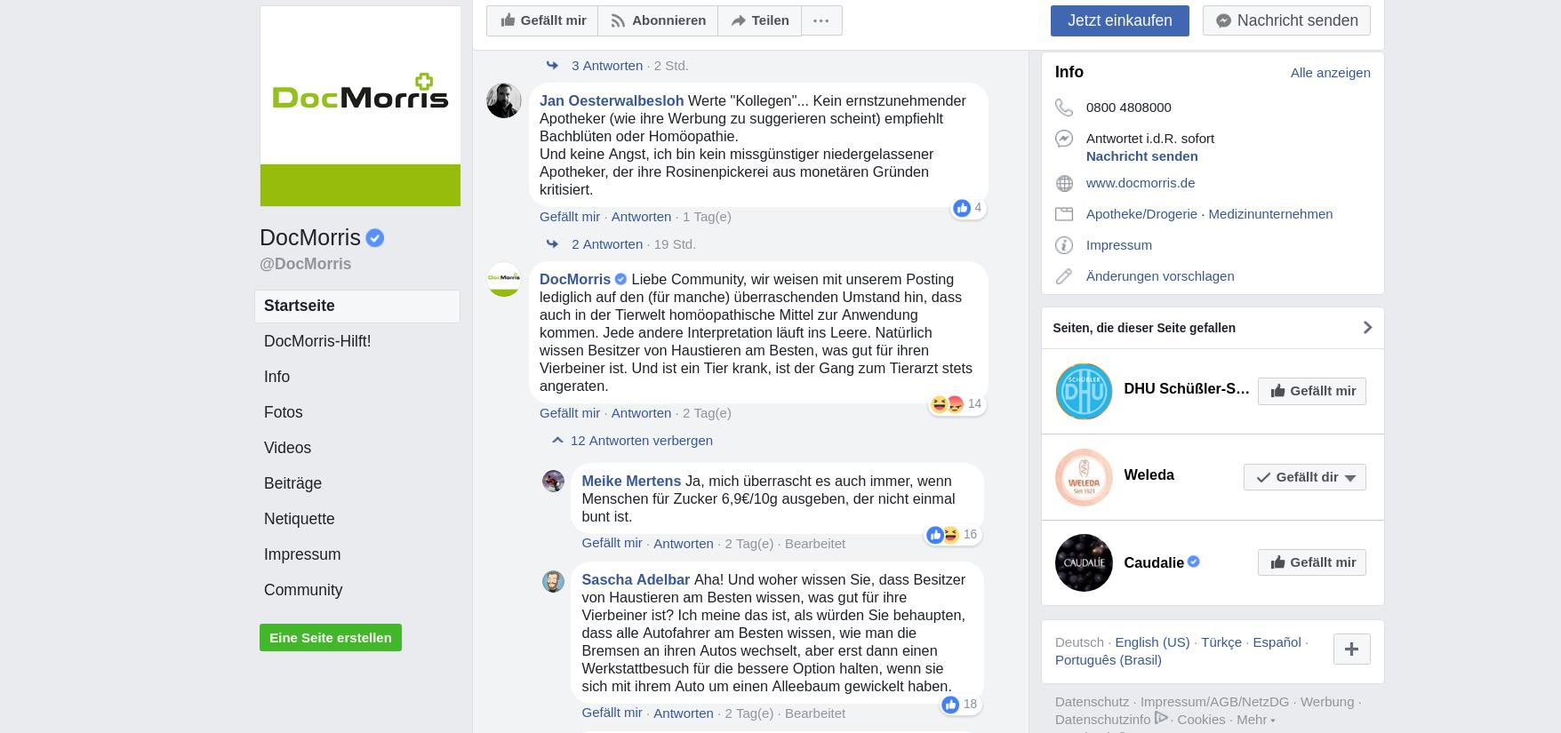 DocMorris preist auf Facebook Homöopathie für Tiere an. Die Nutzer finden das gar nicht gut und bombardieren die Versandapotheke mit negativen Kommentaren.