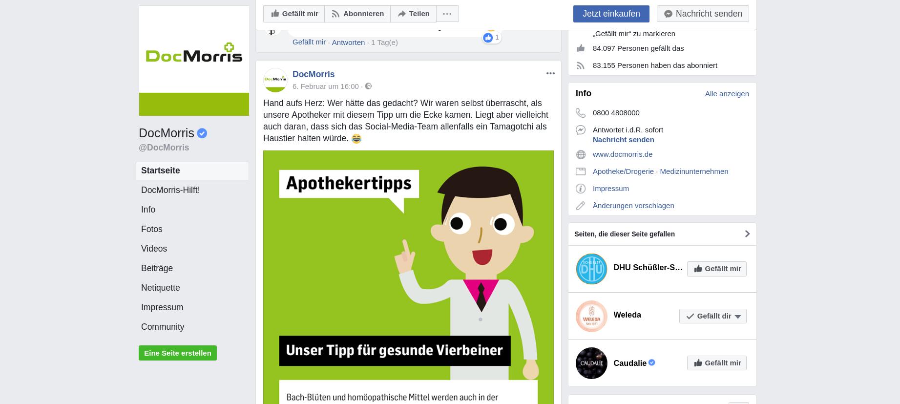 „Unser Tipp für gesunde Vierbeiner“, steht auf dem Bild, das einen Apotheker mit erhobenen Zeigefinger zeigt. Weiter heißt es: „Bach-Blüten und homöopathische Mittel werden auch in der Behandlung von Haustieren immer beliebter.“ Dem Posting-Text zufolge war man bei DocMorris selbst überrascht, „als unsere Apotheker mit diesem Tipp um die Ecke kamen“. Von der Versandapotheke war dieser Beitrag wohl witzig gemeint, bei den Facebook-Nutzern kam der Post hingegen nicht so gut an.
