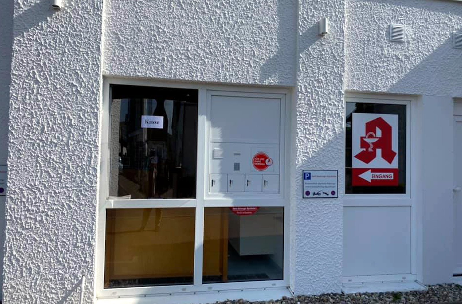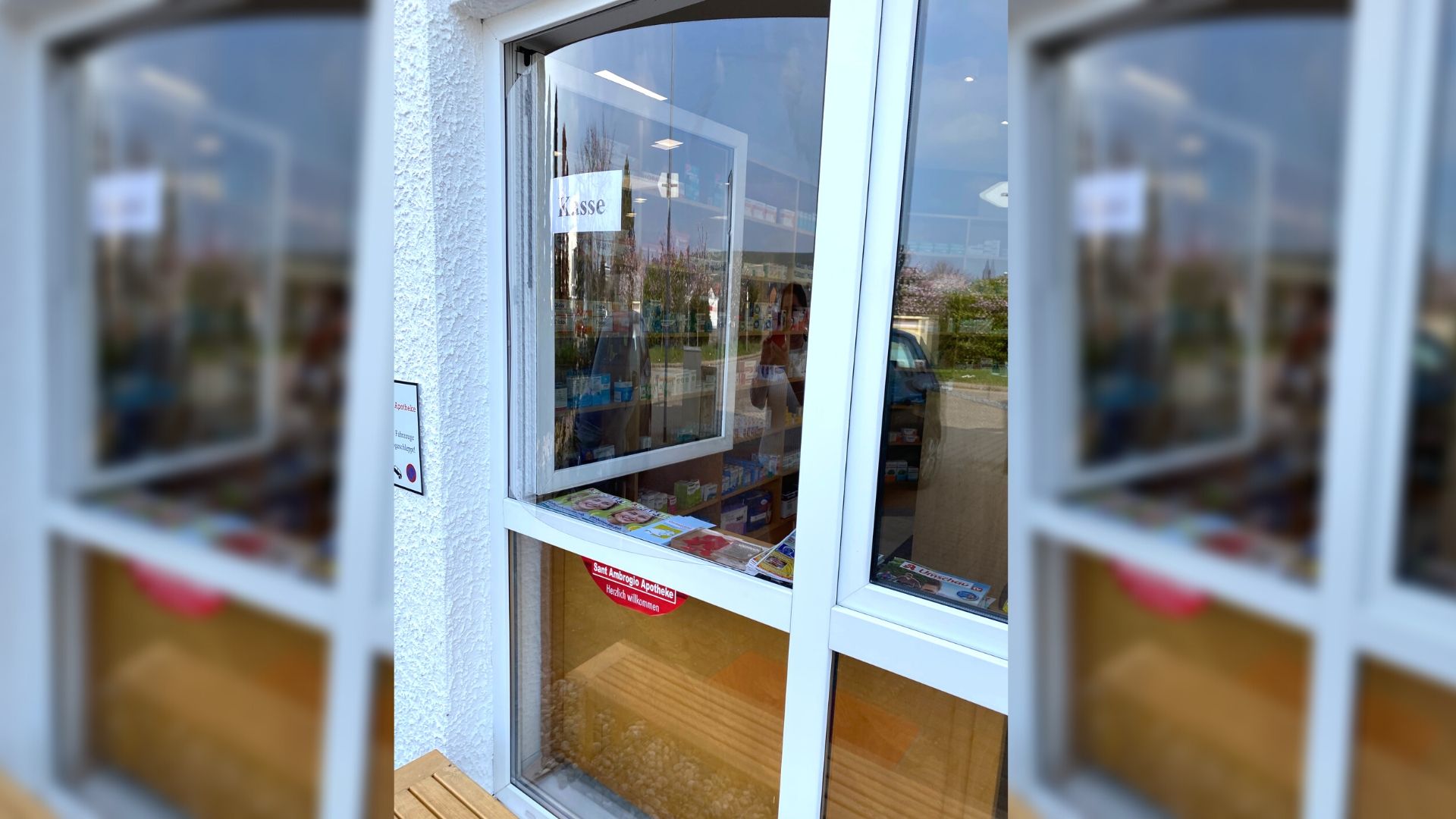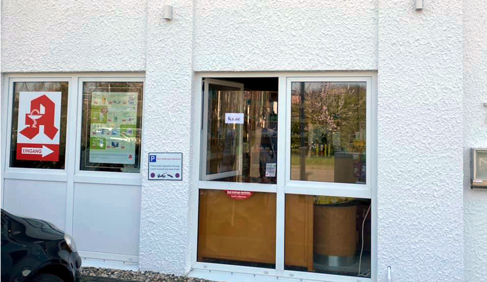 Der Haupteingang ist dauerhaft geöffnet, sodass die Offizin gut belüftet ist. Rein können die Kunden nicht – vor dem Eingang sind Blumenkästen so platziert, dass ein Eintreten nicht möglich ist. Schilder weisen den Kunden auf die Vorgehensweise hin. Links und rechts vom Haupteingang befinden sich normalerweise Fenster der Apotheke, diese wurden nun zu Beratungsplätzen umfunktioniert. Die nun dauerhaft geöffneten Fenster sind aktuell mit Plexiglas bestückt, so können die Kunden weiterhin bedient werden und es besteht gleichzeitig ein Schutz vor Tröpfcheninfektion. Der momentan geforderte Abstand von zwei Metern kann weitestgehend eingehalten werden. Die Plexiglasscheibe im Fenster ist leicht gewölbt, so kann die Ware und das Geld unterhalb der Scheibe übergeben werden.