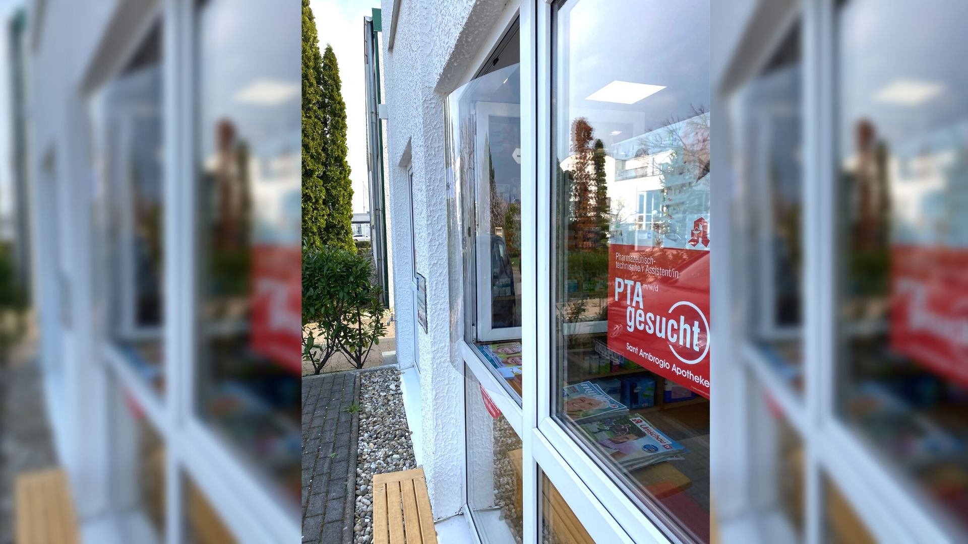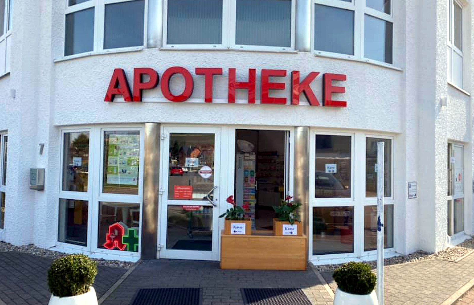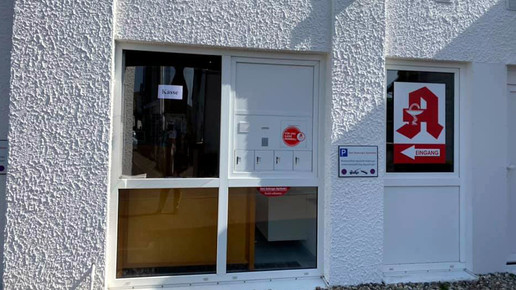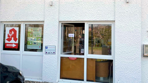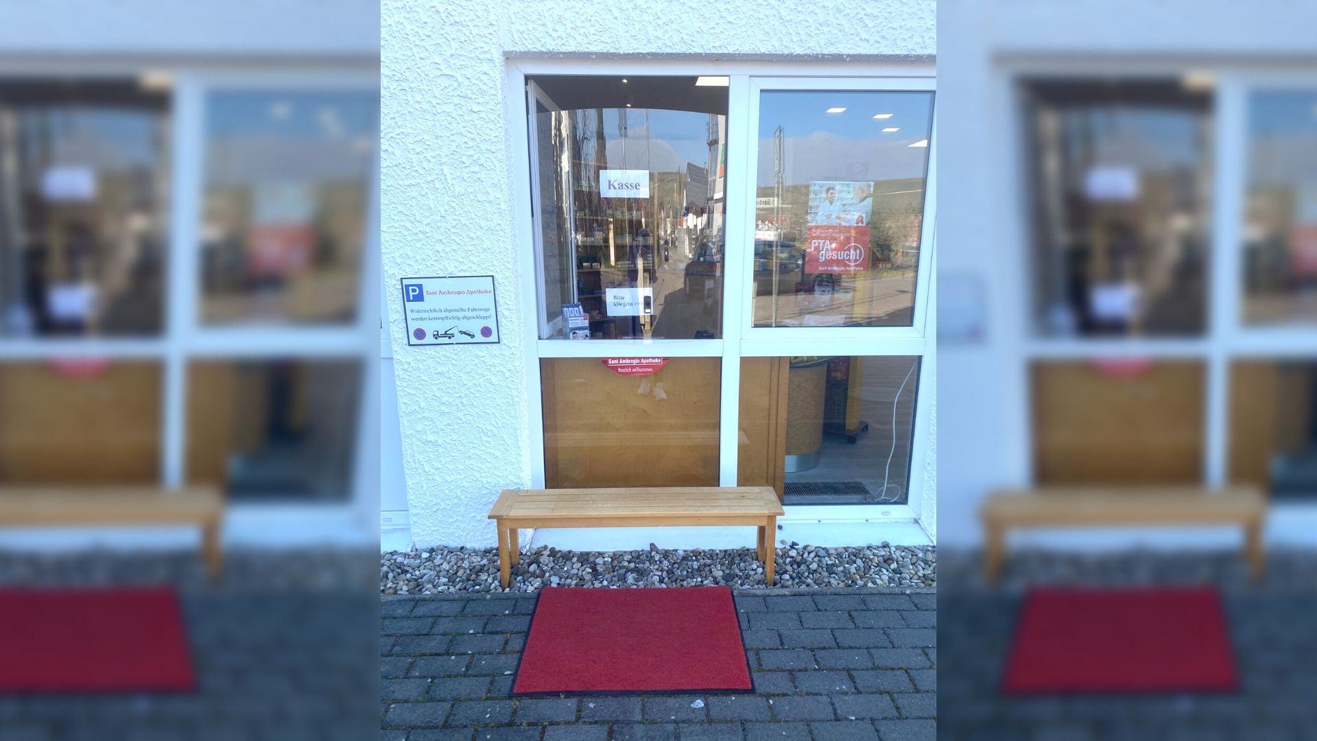 Der Haupteingang ist dauerhaft geöffnet, sodass die Offizin gut belüftet ist. Rein können die Kunden nicht – vor dem Eingang sind Blumenkästen so platziert, dass ein Eintreten nicht möglich ist. Schilder weisen den Kunden auf die Vorgehensweise hin. Links und rechts vom Haupteingang befinden sich normalerweise Fenster der Apotheke, diese wurden nun zu Beratungsplätzen umfunktioniert. Die nun dauerhaft geöffneten Fenster sind aktuell mit Plexiglas bestückt, so können die Kunden weiterhin bedient werden und es besteht gleichzeitig ein Schutz vor Tröpfcheninfektion. Der momentan geforderte Abstand von zwei Metern kann weitestgehend eingehalten werden. Die Plexiglasscheibe im Fenster ist leicht gewölbt, so kann die Ware und das Geld unterhalb der Scheibe übergeben werden.