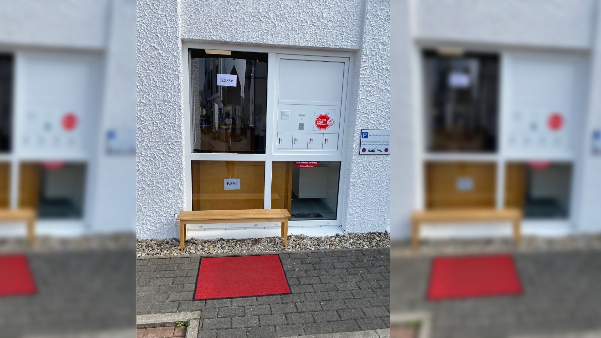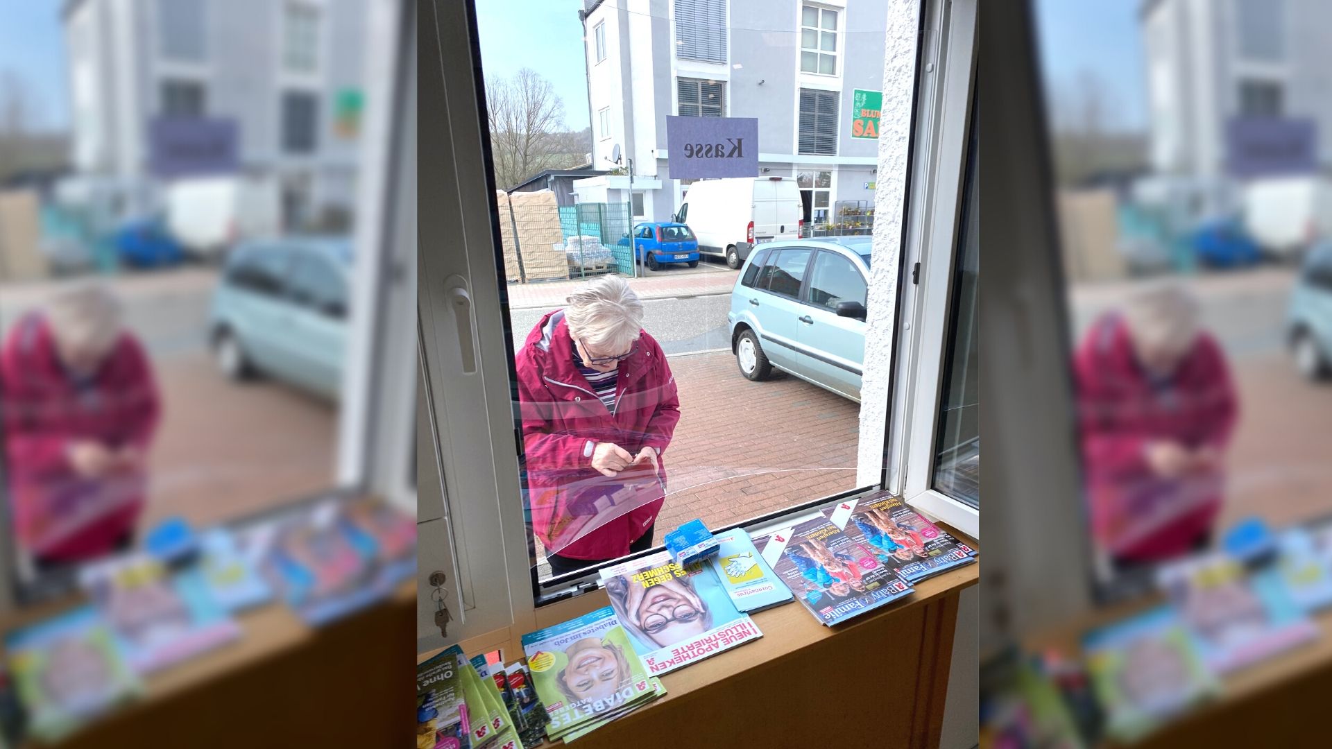Vor der neuen Outdoor-Kasse steht eine Bank, auf der Kunden sich kurz setzen können, sofern sie in ihrer Mobilität eingeschränkt sind. Das System wird seitens der Kunden gut angenommen. Im Fenster liegen die Zeitschriften aus – die Beratung soll trotz räumlicher Trennung so normal wie möglich ablaufen. Kunden können so normal weiter informiert werden, ohne dass es zu einer Tröpfcheninfektion kommt. Kupperts Mitarbeiter arbeiten aktuell ohne Maske oder Handschuhe, eine Desinfektion der Hände findet regelmäßig statt.