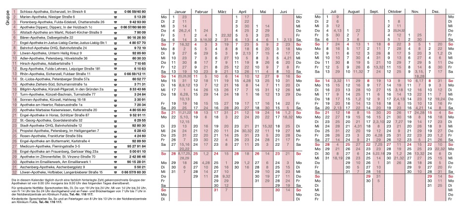Zahn geht außerdem auf die vielbesetzten Termine im Notdienstkalender ein: „Aufgrund der verhältnismäßig hohen Anzahl von Apotheken in Fulda (Stadt) hat das System unter dem Aspekt der zeitlichen Gerechtigkeit an einigen Tagen mehrere Apotheken zum Notdienst im Stadtgebiet eingeteilt. Hier haben wir zusammen mit den Betroffenen eine Lösung gefunden und nochmals geringfügige Anpassungen an der Notdiensteinteilung vorgenommen.“