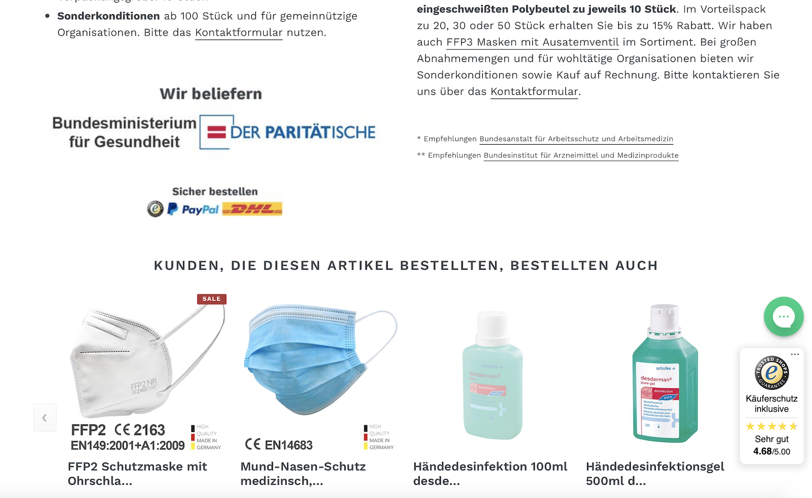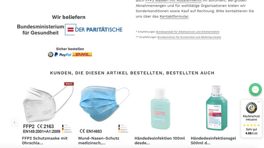 In seinem Webshop wirbt der Hersteller noch damit, auch das Bundesgesundheitsministerium (BMG) und den Paritätischen Wohlfahrtsverband zu beliefern. 10 Stück kosten 60 Euro, ab 97 Euro entfallen die Versandkosten von 4,95 Euro. Sonderkonditionen gibt es ab 100 Stück und für gemeinnützige Organisationen.