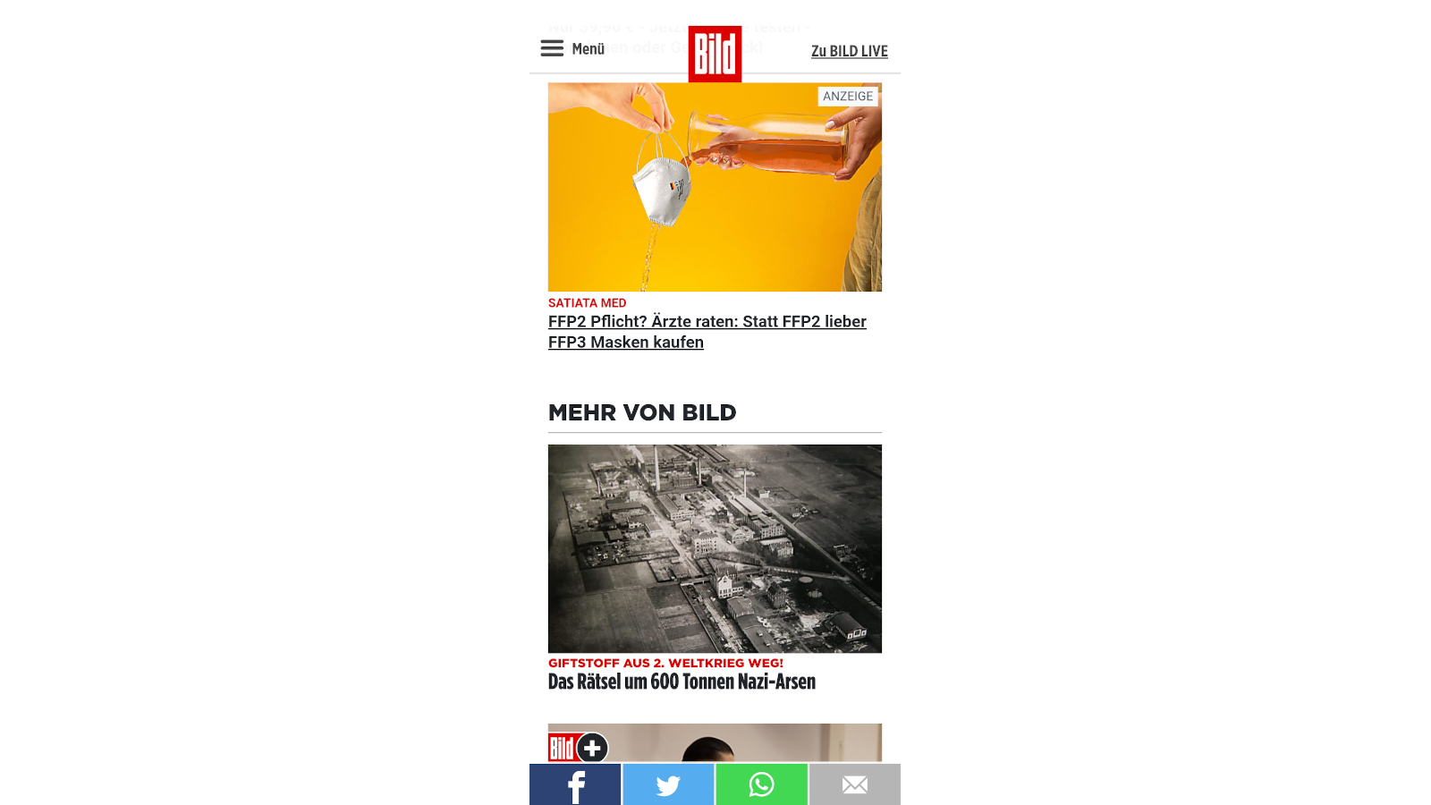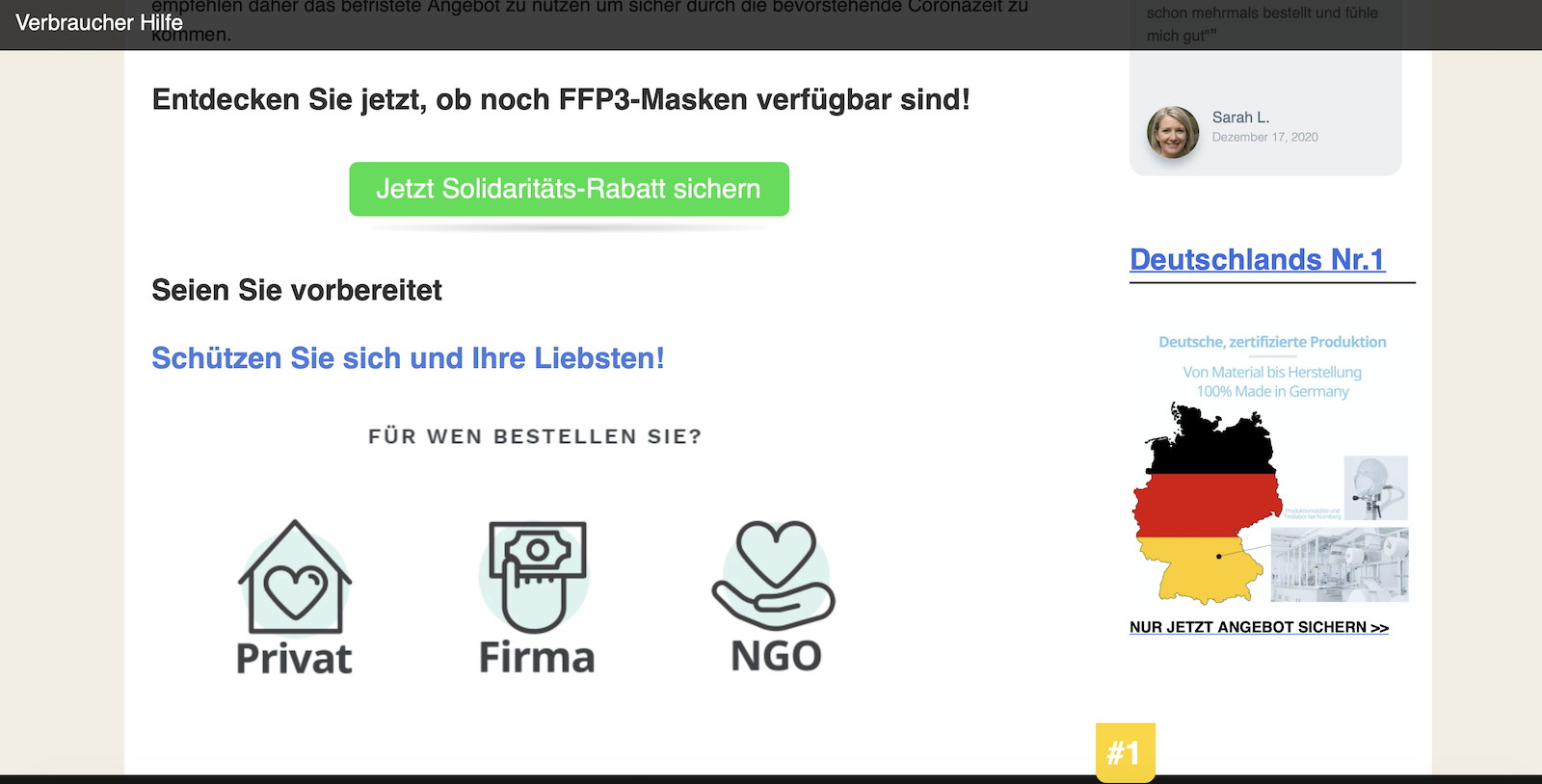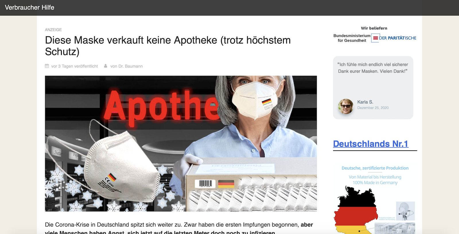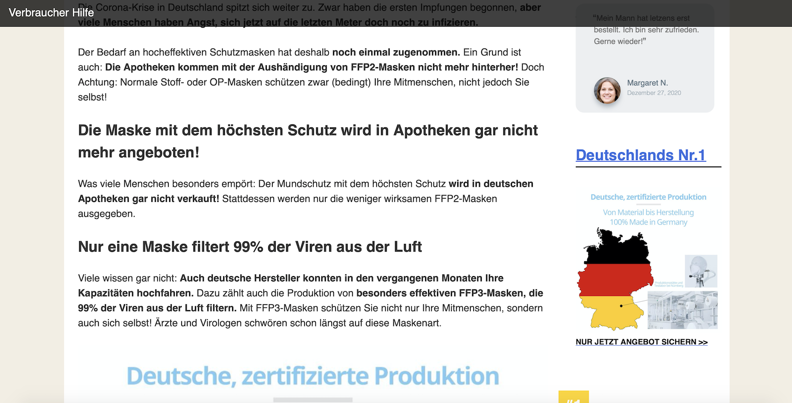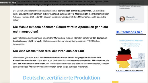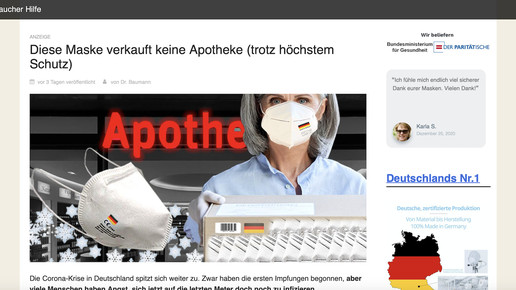 „FFP2-Pflicht? Ärzte raten: Statt FFP2- lieber FFP3-Masken kaufen“, heißt es in der Werbeanzeige bei Bild. Ein Click auf den Link, und man landet auf Verbraucher-Hilfe.de, einer jener Websites, die wie eine Nachrichtenseite aufgebaut sind, in Wirklichkeit aber Werbecontent verbreiten. Hier heißt es: „Diese Maske verkauft keine Apotheke (trotz höchstem Schutz)“.
