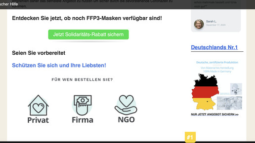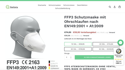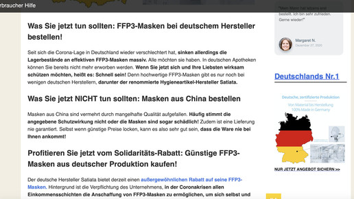 Während die Menschen auf den Corona-Impfstoff warten, diskutiert die Politik über eine FFP2-Pflicht – mit der Folge, dass Nachfrage und Preise sprunghaft steigen. Das ruft erneut Glücksritter auf den Plan: Die Firma Satiata Med wirbt bei Bild.de für ihre Masken – die deutlich besser seien als die aus der Apotheke.