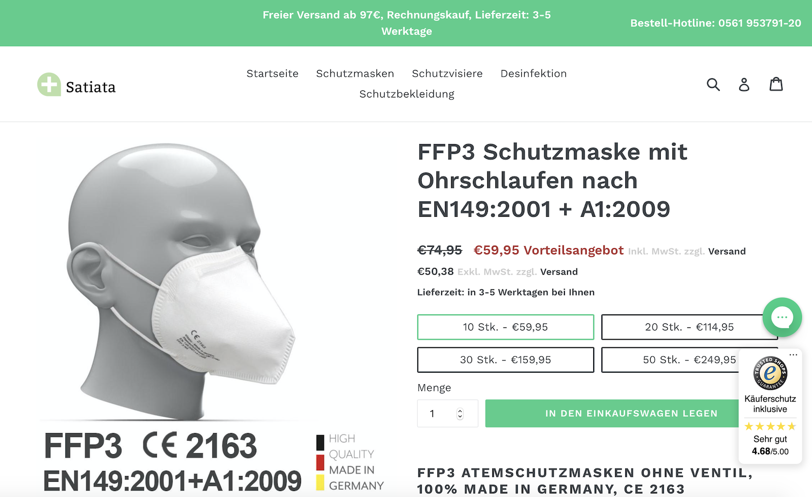 Dann wird ein „Solidaritäts-Rabatt“ ausgerufen, den man sich sichern sollte: „Der deutsche Hersteller Satiata bietet derzeit einen außergewöhnlichen Rabatt auf seine FFP3-Masken. Hintergrund ist die Verpflichtung des Unternehmens, in der Coronakrisen allen Einkommensschichten die Anschaffung von FFP3-Masken zu ermöglichen, um sich selbst und andere bestmöglich zu schützen.“