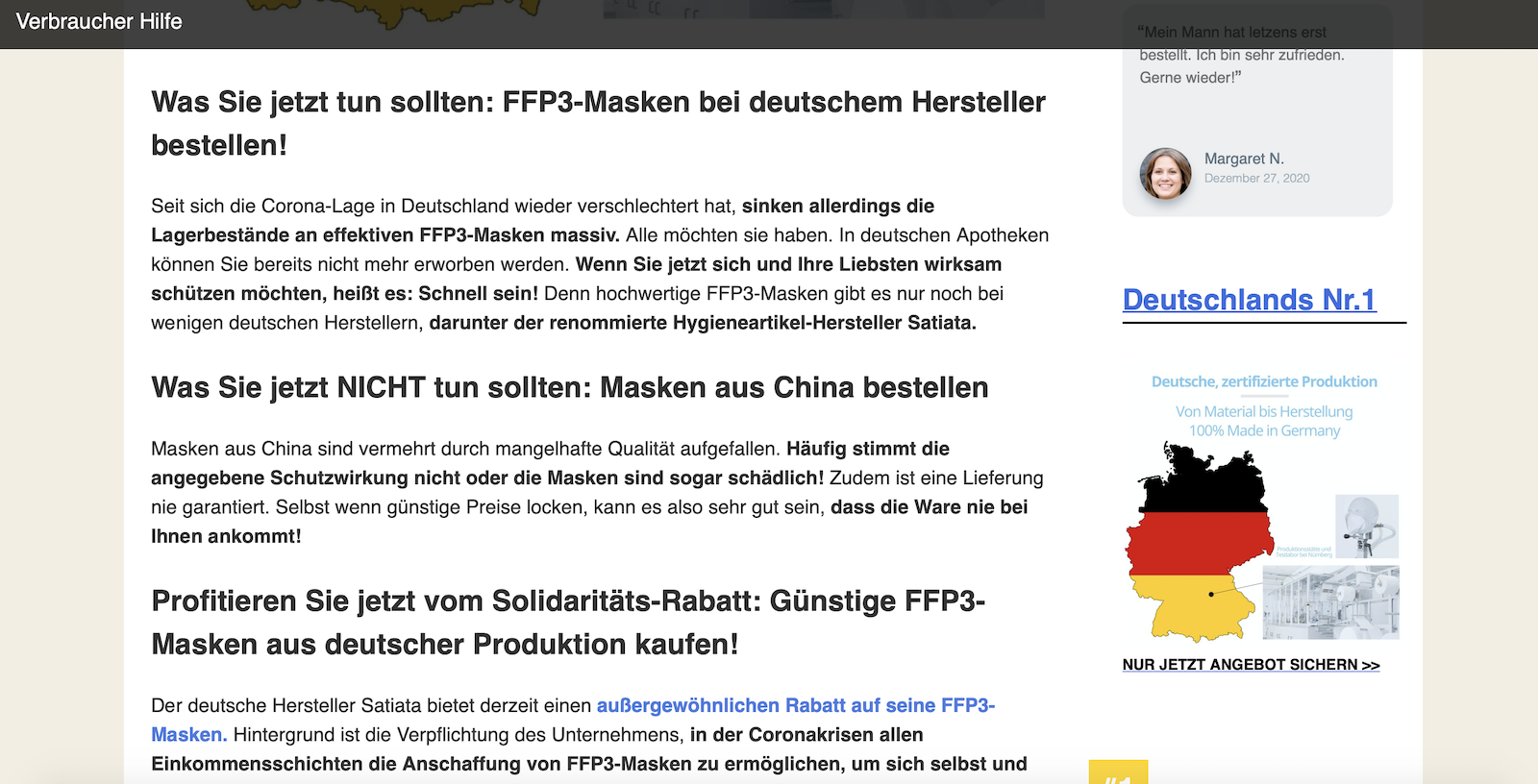„Was Sie jetzt tun sollten: FFP3-Masken bei deutschem Hersteller bestellen!“ Seit sich die Corona-Lage in Deutschland wieder verschlechtert habe, sinken laut Beitrag die Lagerbestände massiv. „Alle möchten sie haben. In deutschen Apotheken können Sie bereits nicht mehr erworben werden. Wenn Sie jetzt sich und Ihre Liebsten wirksam schützen möchten, heißt es: Schnell sein! Denn hochwertige FFP3-Masken gibt es nur noch bei wenigen deutschen Herstellern, darunter der renommierte Hygieneartikel-Hersteller Satiata.“