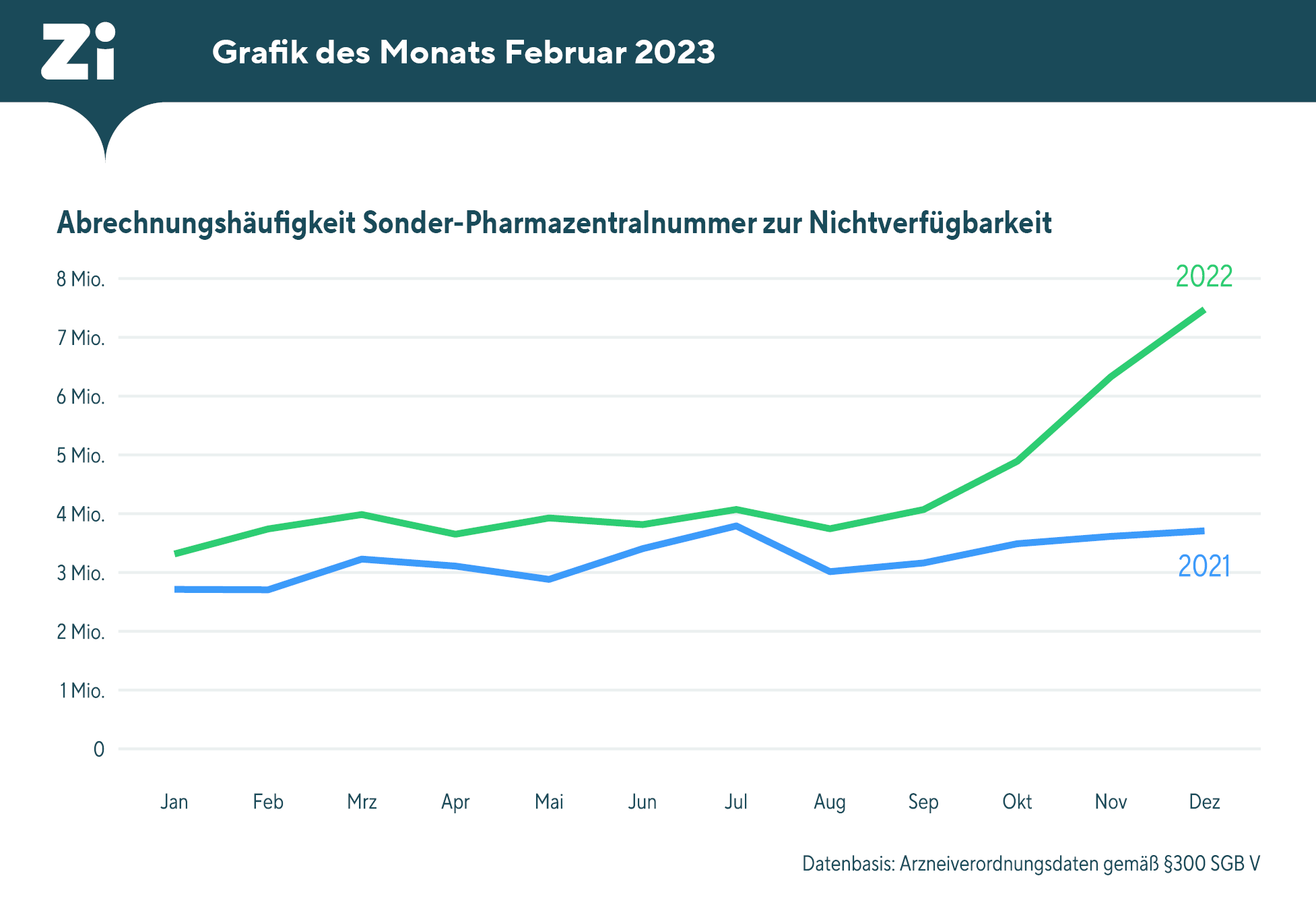 Lieferengpässe sind nur schwer zu messen, da nicht dokumentiert wird, was nicht abgegeben werden konnte. Laut einer Blitzumfrage des Apothekerverbands Nordrhein (AVNR) ist fast jedes zweite Rezept betroffen. Das Zi hat sich Abrechnungsdaten angeschaut und geprüft, wie oft die Sonder-PZN 02567024 für Nichtverfügbarkeit angegeben wurde. Sie kommt zwar nur im Generika- und importrelevanten Markt zum Tragen, auch werden andere Sonder-PZN nicht erfasst. Im Zeitverlauf ist laut Zi aber eine aktuelle Verschärfung der Lage zu beobachten.