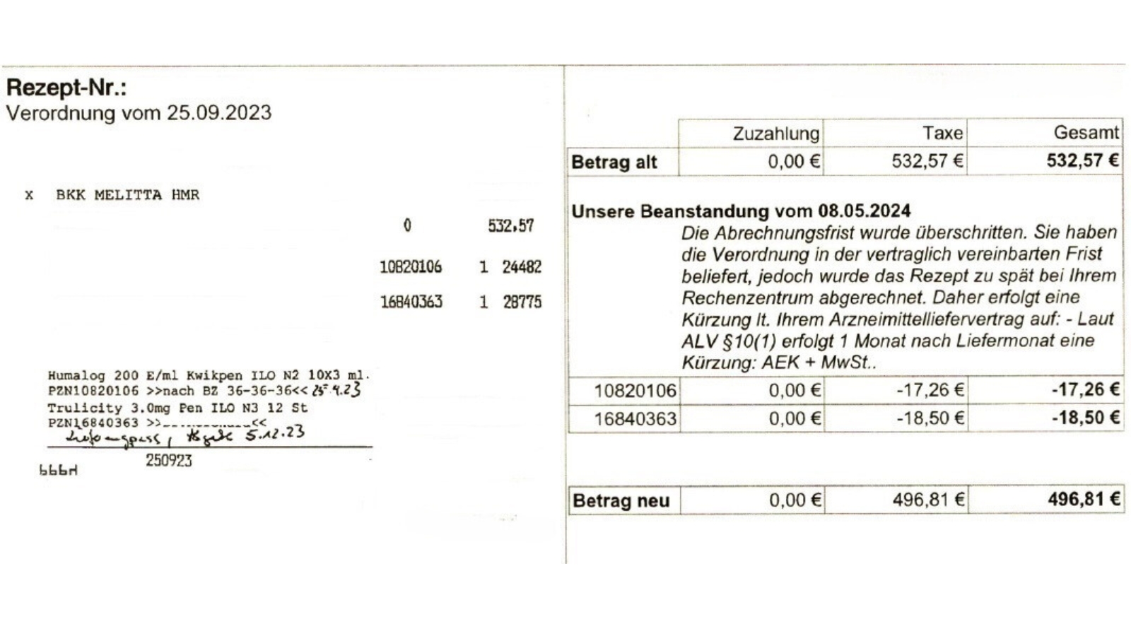 „Wir haben uns genau beim Apothekerverband bezüglich der Dokumentation und des Vermerks auf dem Rezept informiert und sind genau so vorgegangen, wie es im Rahmenvertrag vorgegeben ist“, berichtet die Apothekerin. „Trotzdem haben wir bislang neun Absetzungen wegen verspäteter Einreichung bekommen.“