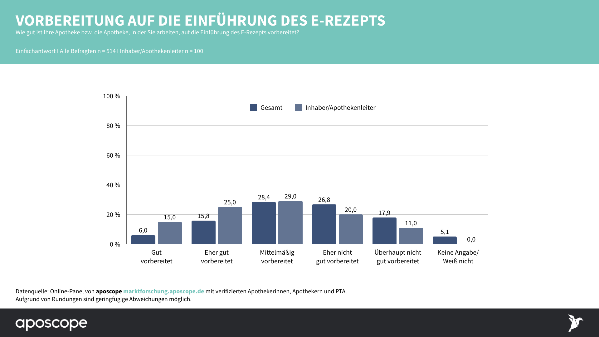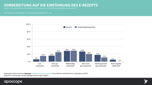 Das E-Rezept kann kommen – aufhalten lässt es sich ohnehin nicht. Wenige Monate vor dem offiziellen Launch fühlen sich laut der aktuellen apsocope-Digitalisierungsstudie „Status Quo 2020: Digitalisierung in der Apotheke” vier von zehn Apothekenleitern halbwegs gut vorbereitet. Dennoch bleibt die Skepsis vor allem bei den Inhabern groß.
