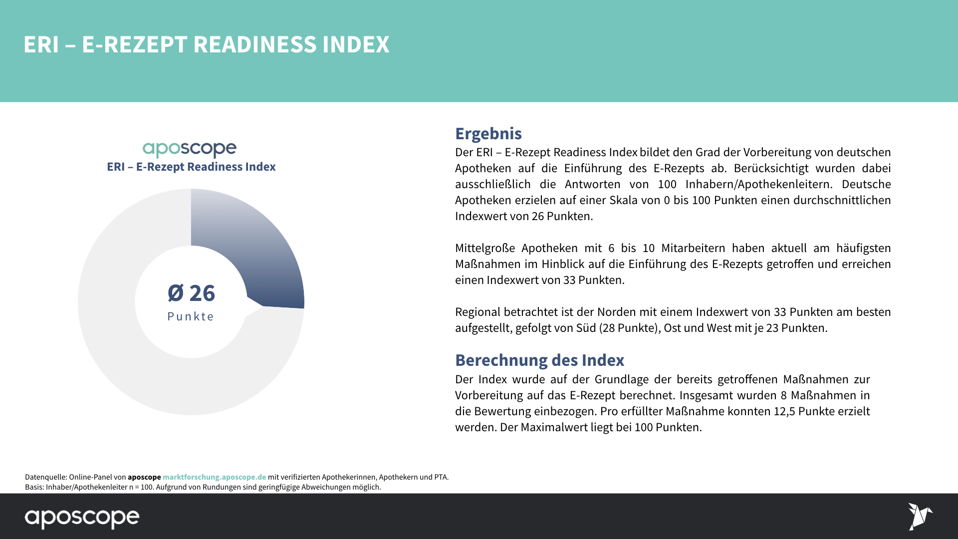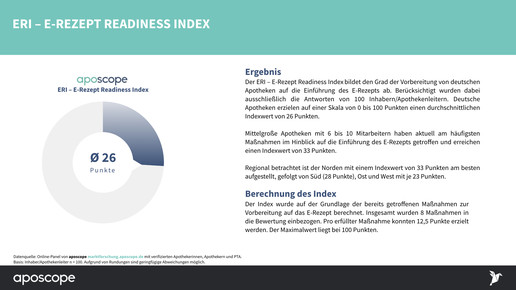 Auf Grundlage des von der Gematik herausgegebenen technischen Anforderungskatalogs für die Einführung des E-Rezepts haben die Marktforscher einen sogenannten E-Rezept-Readiness-Index (ERI) erstellt. Auf einer Skala von 0 bis 100 Punkten erzielen die Apotheken demnach aktuell einen durchschnittlichen Indexwert von 26 Punkten.