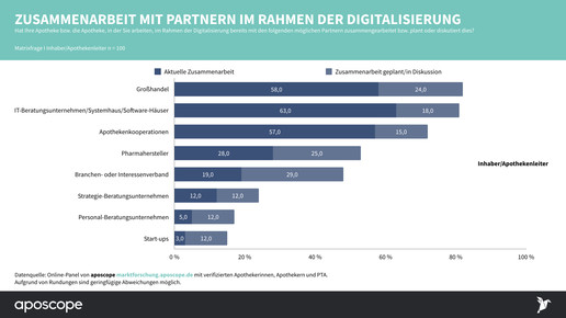 Nichtsdestotrotz arbeiten die Apotheken bei Fragen zur Digitalisierung aktuell oder künftig eher mit ihren Geschäftspartnern zusammen als mit ihrer Interessenvertretung: