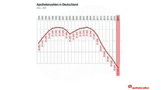 Die Zahl der Apotheken geht seit dem Höchststand mit 21.602 Betriebsstätten im Jahr 2008 zurück. 2017 sank die Zahl erstmals auf unter 20.000 Apotheken. Im Vergleich zu 2008, also vor zehn Jahren sind es 2073 Apotheken weniger. Das entspricht einem Rückgang um 10,6 Prozent.