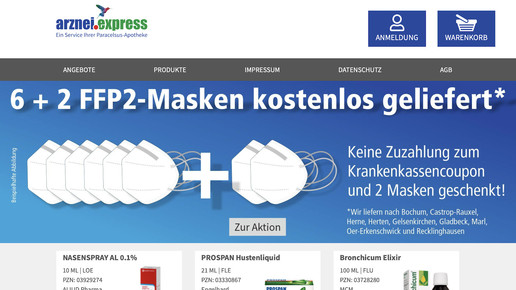 Arznei.Express verspricht: „Wir schenken Ihnen die Eigenbeteiligung sowie 2 weitere Masken und liefern alles kostenlos zu Ihnen nach Hause.“ Kunden können sich online registrieren, auf Zeitungsanzeigen ist ein QR-Code abgedruckt. Außerdem spendet die Paracelsus-Apotheke in Castrop-Rauxel für jeden Kunden der FFP2-Aktion zusätzlich 2 Euro an den Verein „Bildung für Gambia“.