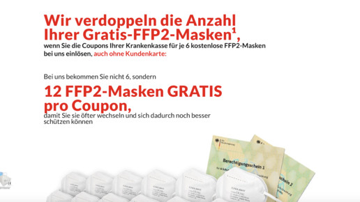 Die Neue Apotheke in Herne – die wie die in Recklinghausen Inhaberin Annegret Koglin gehört – wirbt hingegen mit sechs zusätzlichen Masken: „Wir verdoppeln die Anzahl Ihrer Gratis-FFP2-Masken“, heißt es auf ihrer Website und in Zeitungsanzeigen. „Bei uns bekommen Sie nicht 6, sondern 12 FFP2-Masken gratis pro Coupon, damit Sie sie öfter wechseln und sich dadurch noch besser schützen können.“ Das Angebot gilt explizit „auch ohne Kundenkarte“. Auch hier wird auf den Eigenanteil verzichtet, die Apotheke wirbt mit „kostenloser Lieferung Ihrer FFP2-Masken an Ihre Wunschadresse, wenn Sie nicht zu uns kommen können“.