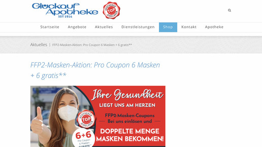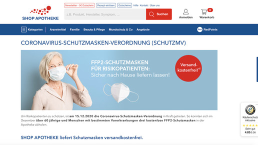 „Unser Corona-Hilfspaket für alle über-60-Jährigen und Risikopatienten, die die Coupons ihrer Krankenkasse für je 6 kostenlose FFP2-Masken bei uns einlösen“, heißt es auf der Website apo40.de, die zur Neuen Apotheke in Recklinghausen Süd gehört. Hier bekommen Kunden vier zusätzliche FFP2-Masken pro Coupon – also zehn statt sechs Masken pro Coupon, „damit Sie sie öfter wechseln und sich dadurch noch besser schützen können“. Außerdem verzichtet die Apotheke auf den Eigenanteil von 2 Euro und spendiert zusätzlich 5 Euro in Form eines Gutscheins „für die Gesundheitsprodukte Ihrer Wahl, zum Beispiel damit Sie Ihr Immunsystem stärken“. Neben Versand- entfallen auch Portokosten, die Apotheke stellt entsprechend Freiumschläge bereit.