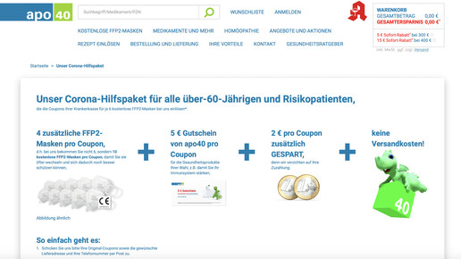 „Unser Corona-Hilfspaket für alle über-60-Jährigen und Risikopatienten, die die Coupons ihrer Krankenkasse für je 6 kostenlose FFP2-Masken bei uns einlösen“, heißt es auf der Website apo40.de, die zur Neuen Apotheke in Recklinghausen Süd gehört. Hier bekommen Kunden vier zusätzliche FFP2-Masken pro Coupon – also zehn statt sechs Masken pro Coupon, „damit Sie sie öfter wechseln und sich dadurch noch besser schützen können“. Außerdem verzichtet die Apotheke auf den Eigenanteil von 2 Euro und spendiert zusätzlich 5 Euro in Form eines Gutscheins „für die Gesundheitsprodukte Ihrer Wahl, zum Beispiel damit Sie Ihr Immunsystem stärken“. Neben Versand- entfallen auch Portokosten, die Apotheke stellt entsprechend Freiumschläge bereit.