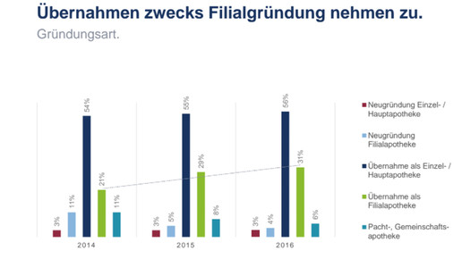 Die meisten „Gründungen“ sind genau genommen Besitzerwechsel: Während der Anteil der übernommenen Haupt- und Einzelapotheken mit 56 Prozent annähernd stabil (2014: 54 Prozent) ist, ist die Quote der Apotheken, die vom neuen Besitzer als Filiale weiter betrieben werden, von 21 auf 31 Prozent gewachsen. Der Rest entfällt auf Pacht- und Gemeinschaftsapotheken, deren Anteil von 11 auf 6 Prozent gesunken ist.