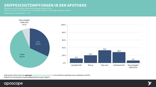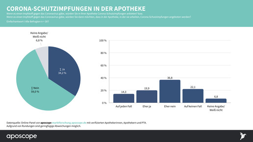 Mit Hochdruck wird an einem Corona-Impfstoff geforscht. Abda-Präsident Friedemann Schmidt setzt sich dafür ein, dass auch in Apotheken geimpft werden darf, wenn es so weit ist. Laut aposcope-Umfrage befürwortet aber nur ein Drittel (34 Prozent) der Teilnehmer eine Beteiligung der Apotheken, 60 Prozent lehnen dies ab. Bezogen auf die „normale“ Grippeschutzimpfung ist das Verhältnis ebenso (32 zu 62 Prozent).