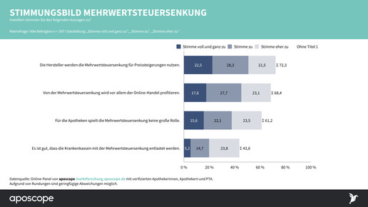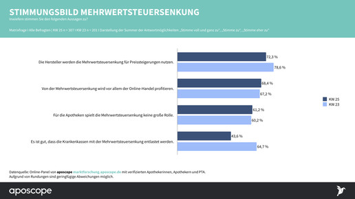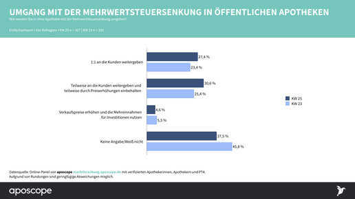 Für Apotheken gilt das zwar nur im OTC- und Freiwahlbereich, tatsächlich gaben aber nur 29 Prozent der Inhaber an, dass sie die Absenkung 1:1 an die Kunden weitergeben werden. Die Hälfte will zumindest einen Teil der „Marge“ einbehalten, eine Minderheit von 8 Prozent sogar die Verkaufspreise entsprechend der Absenkung erhöhen und die Mehreinnahmen für Investitionen nutzen.