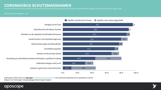 Keine andere Maßnahme wurde so flächendeckend umgesetzt und so konsequent beibehalten wie die Plexiglasscheiben. Zwei Drittel der Teams (66 Prozent) arbeiten noch immer mit Mund-Nasen-Schutz, doch 10 Prozent haben diese Maßnahme inzwischen wieder abgeschafft. Ein ähnliches Bild zeigt sich bei der Begrenzung der Kundenzahl in der Offizin: 80 Prozent behalten dies vorerst bei, 9 Prozent haben heute keine solche Beschränkung mehr. Mehr Details zur Umsetzung anderer Maßnahmen gehen aus den Charts hervor.