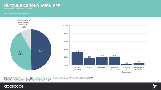 Seit dieser Woche ist die Corona-Warn-App der Bundesregierung online. In den ersten 24 Stunden wurde sie 6,4 Millionen Mal heruntergeladen. Die Resonanz ist vorzeigbar, aber es gibt eben auch noch viele Skeptiker. Das ist in den Apotheken nicht anders. Jeder zweite Teilnehmer gab an, die App nutzen zu wollen, 42 Prozent sind dagegen. 8,5 Prozent haben keine Aussage getroffen oder angegeben, kein Smartphone zu besitzen. Rund jeder dritte Befragte (32 Prozent) ist so überzeugt von der App, dass er die Nutzung sogar den Kunden in der Apotheke empfehlen wird.