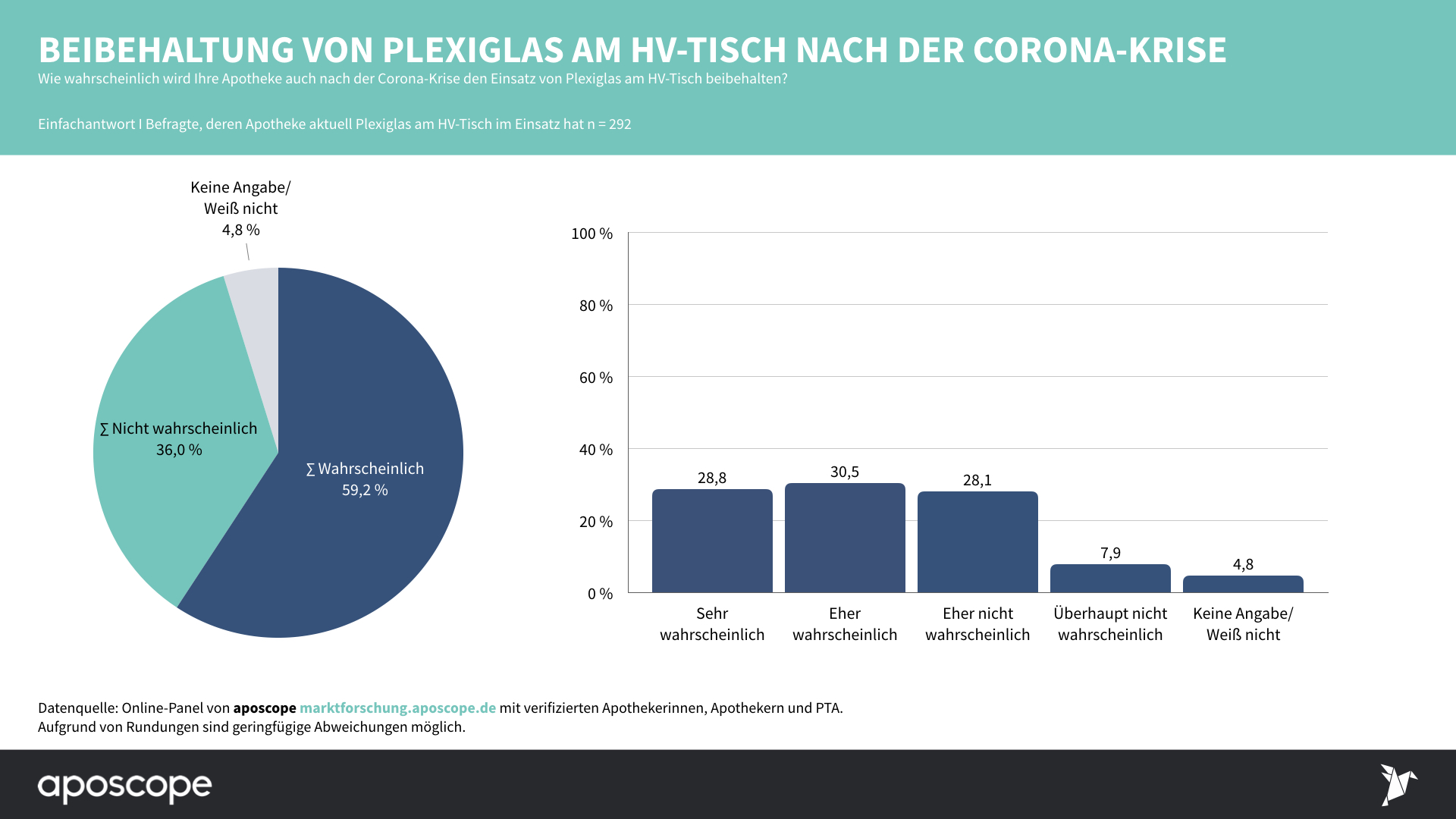 Von den 307 befragten Apothekeninhabern, angestellten Pharmazeuten und PTA gaben 29 Prozent an, dass sie die Plexiglasscheiben „sehr wahrscheinlich“ auch nach der Corona-Krise behalten werden. Weitere 31 Prozent halten das für „eher wahrscheinlich“.