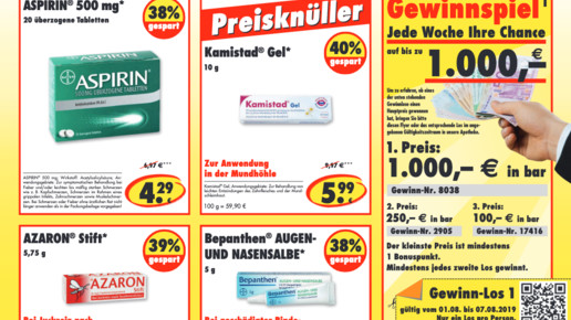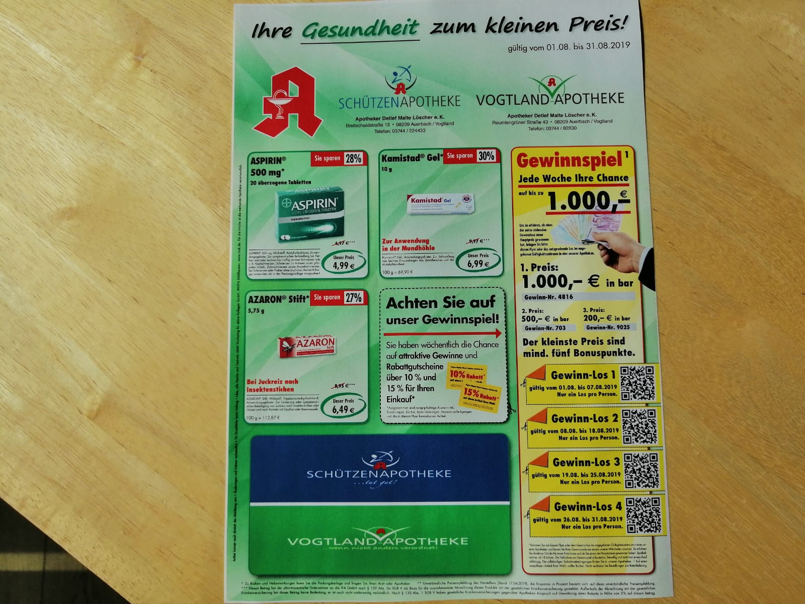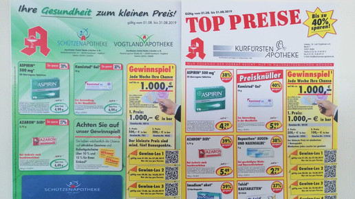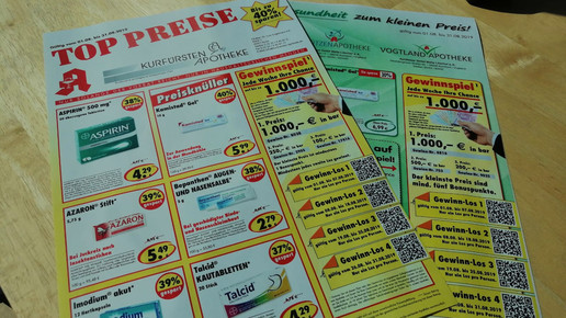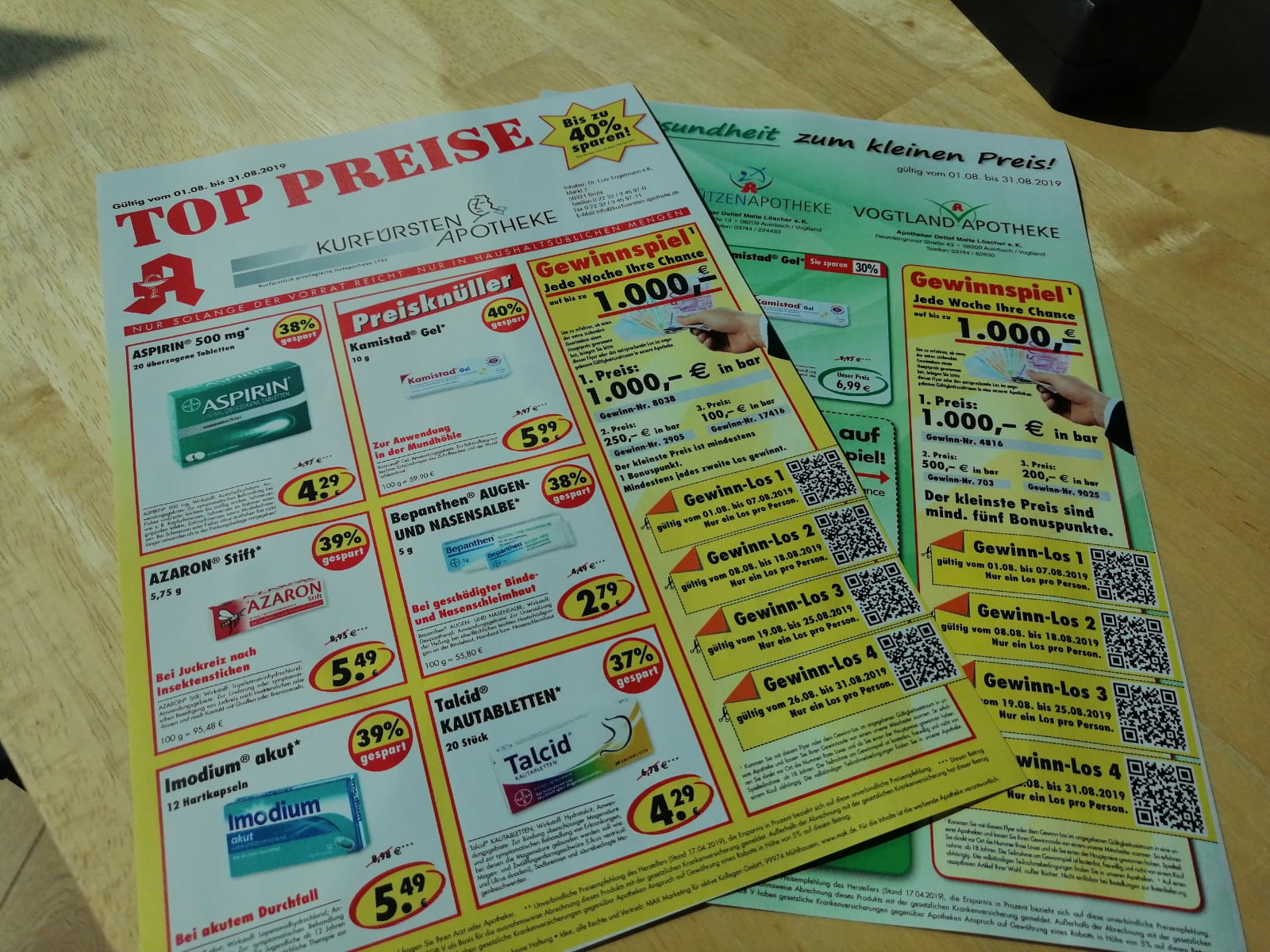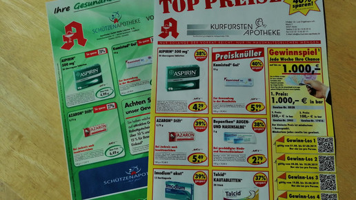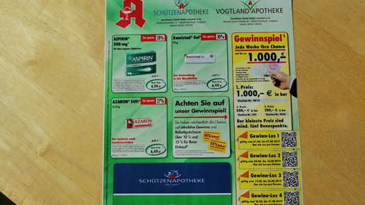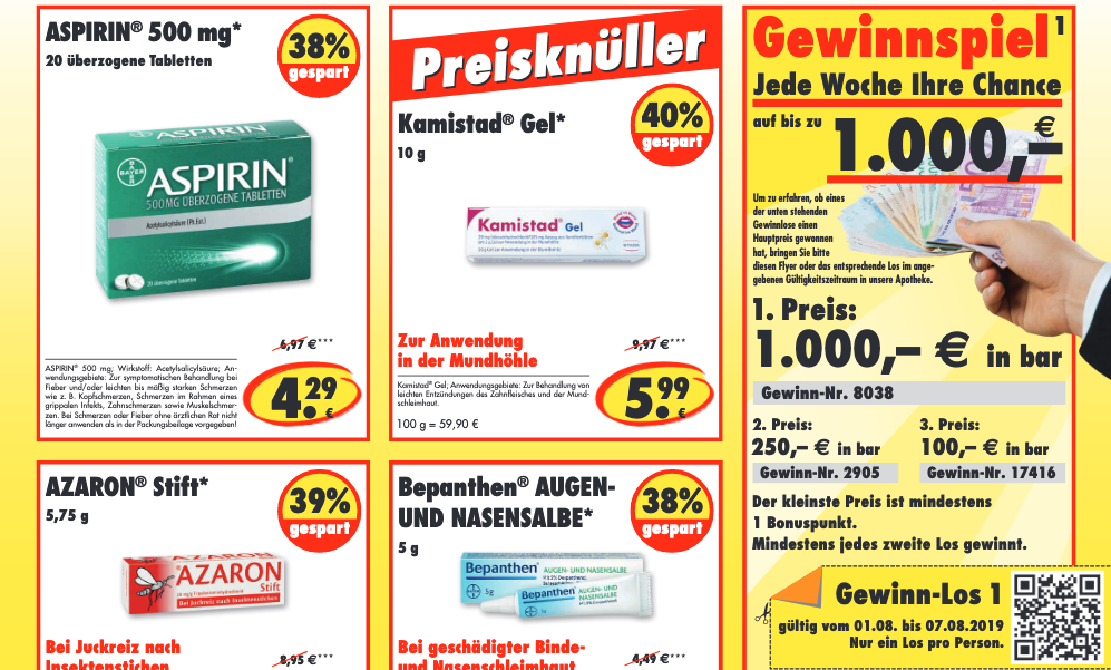 In der anderen Apotheke konnten Kunden im August 2016 jede Woche Bargeld gewinnen: 1000 Euro, 750 Euro oder 500 Euro. Auch hier wurden auf einem Beileger zur Wochenzeitschrift „Super Sonntag“ vier unterschiedliche Gewinncodes abgedruckt, von denen jeweils einer pro Woche in der Apotheke eingelöst werden konnte.