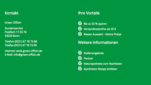 Rezepte sollen bei GreenOffizin ebenfalls eingelöst werden können. Allerdings scheint dieser Teil der Seite im Moment nicht zu funktionieren. Wer mehr Informationen will, erhält lediglich ein leeres Bildschirmfenster. Vor einigen Wochen wurde an dieser Stelle noch auf den Ansprechpartner GreenOffizin24 verwiesen. Als Verantwortlicher wurde der Münchener Apotheker Dr. Mohammed Rihani genannt; mit seiner Rihani Apotheke sowie GreenOffizin24 ist er auch im Versandapothekenregister des DIMDI zu finden.