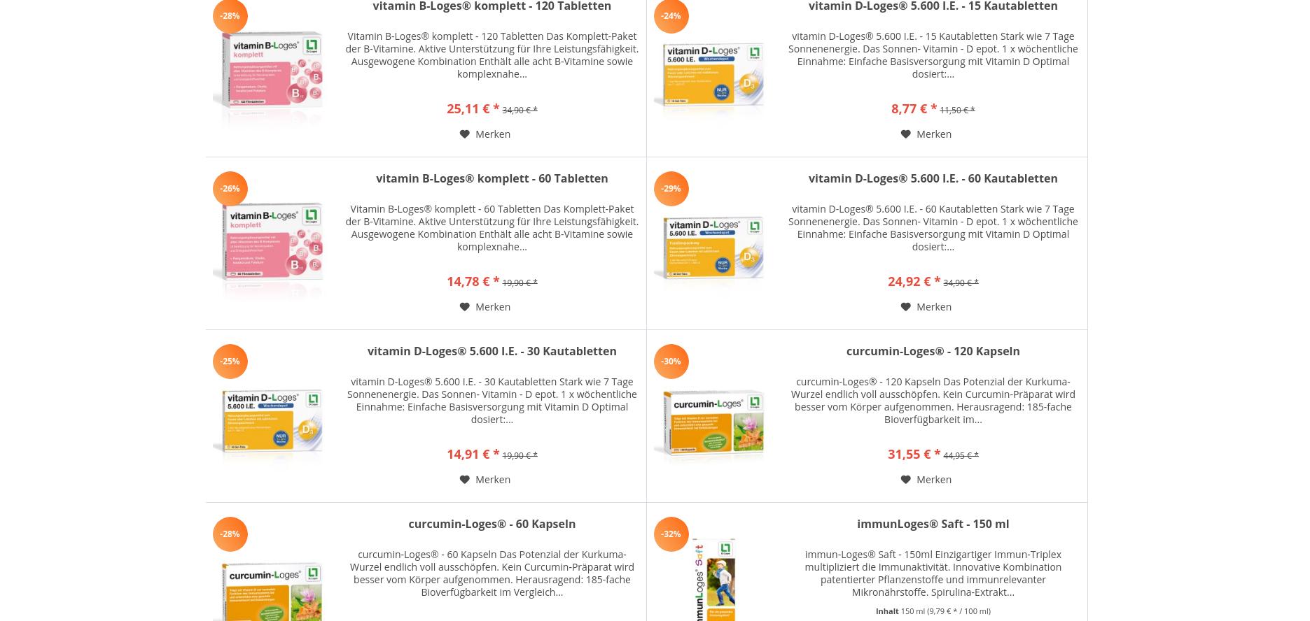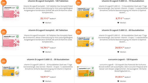 Dr. Loges hat ebenfalls mit einigen Produkten in den Webshop geschafft, genauso wie Allergosan mit OmniBiotic, Metacare und Caricol. Weitere Produkte aus dem Bereich der Nahrungsergänzung sind Panaceo (Geomin), Oxano (Müller-Wohlfahrt) und Boma. Für die Haare gibt es Priorin (Bayer) und Bioxsine (B'Iota). Aus dem Bereich Mundhygiene sind Apacare (Cumdente) und Denttabs zu finden. Als Kosmetik gibt es die ebenfalls aus dem Mass Market bekannte Linie Dalan d'Olive. Ohrstöpsel werden von Alpine und Wellnoise angeboten, Wundprodukte von Kwizda.