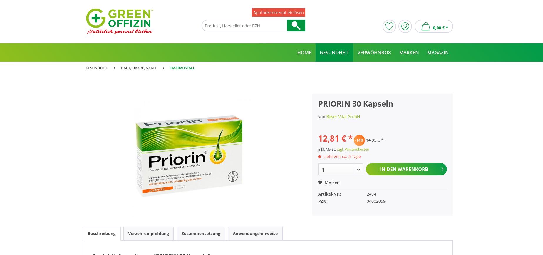 Die Preise bei Green Offizin sind vergleichbar mit anderen Versandapotheken. Eine 500-Gramm-Dose Yokebe Classic kostet 13,99 Euro, bei DocMorris geht das Produkt für 12,82 Euro raus. Eine 150-ml-Flasche ImmunLoges Saft kostet bei der neuen Versandapotheke 14,69 Euro, beim Konkurrenten Sanicare 15,95 Euro. 30 Kapseln Priorin schlagen bei Green Offizin mit 12,81 Euro zu Buche, im Onlineshop der Holderberg Apotheke mit 9,35 Euro.