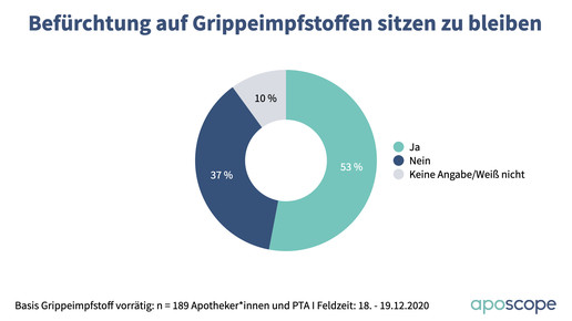 Zwei von drei befragten Apotheker*innen und PTA (63 Prozent) haben in ihrer Apotheke noch Imfpstoff vorrätig, fast ein Viertel (24 Prozent) davon 100 Dosen oder mehr. 53 Prozent der Befragten fürchten, dass sie auf Grippeimpfstoffen sitzen bleiben werden.